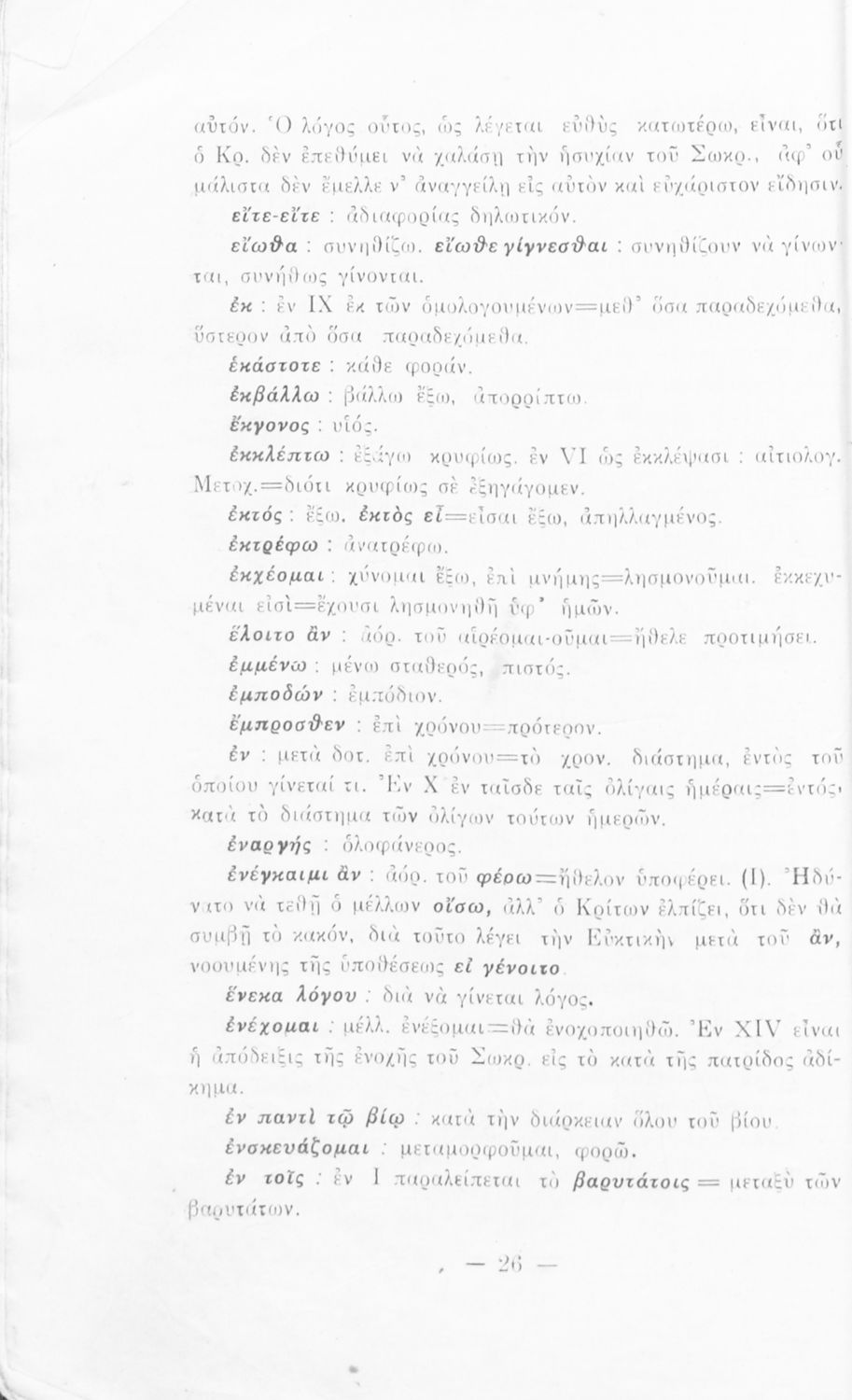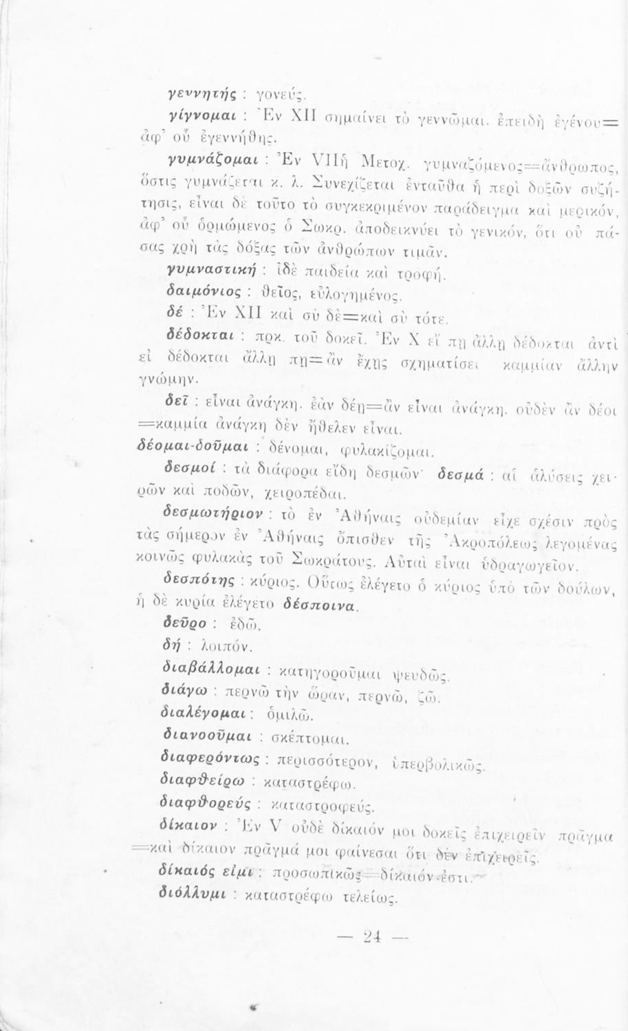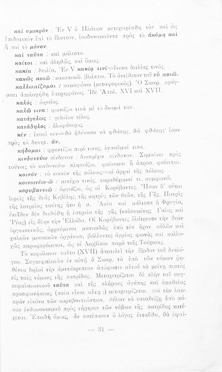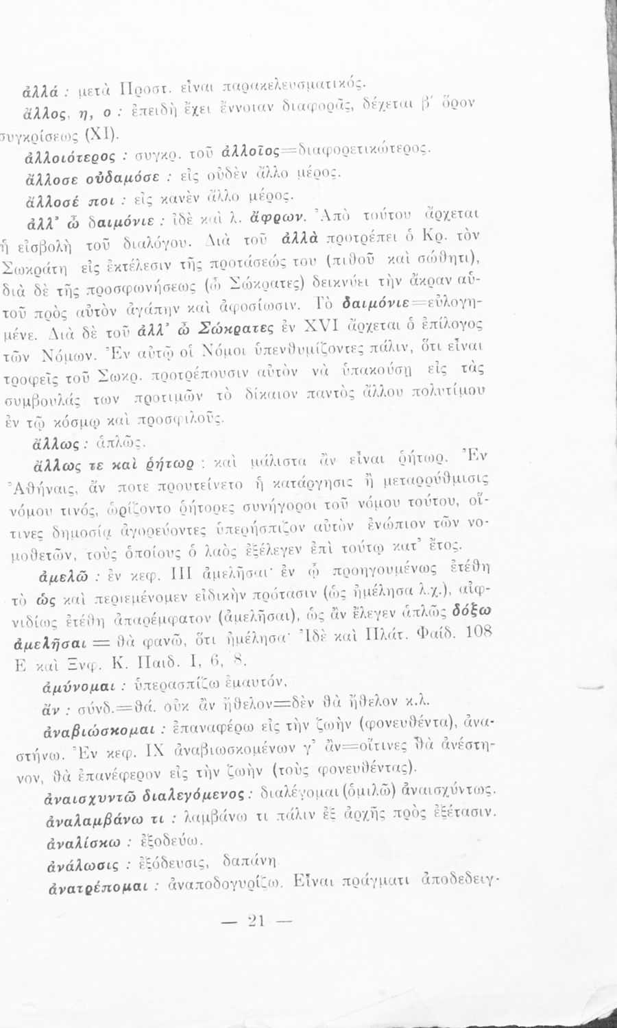 Μαθητικό βοήθημα Αρχαίων Ελληνικών της Γ΄ τάξης των τετρατάξιων Γυμνασίων. Το βιβλίο περιέχει σε μετάφραση το έργο του Πλάτωνα Απολογία του Σωκράτη.