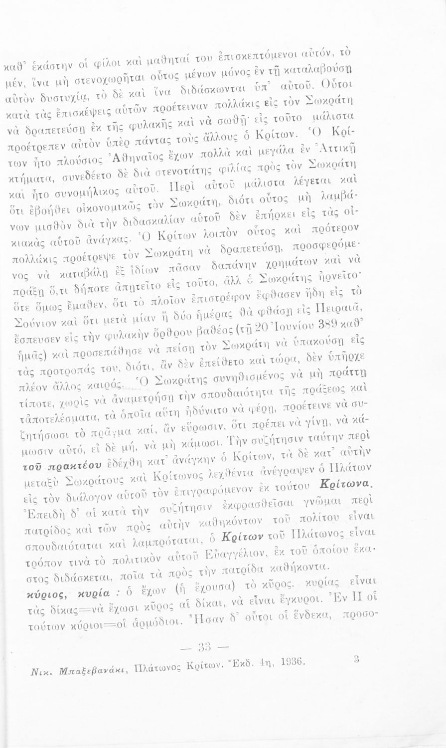Πλάτωνος Κρίτων, εγκεκριμένον προς χρήσιν των μαθητών της Ε΄ τάξεως των εξατάξιων Γυμνασίων και της αντιστοίχου των άλλων σχολείων και διδασκαλείων (μετά λεξιλογίου)