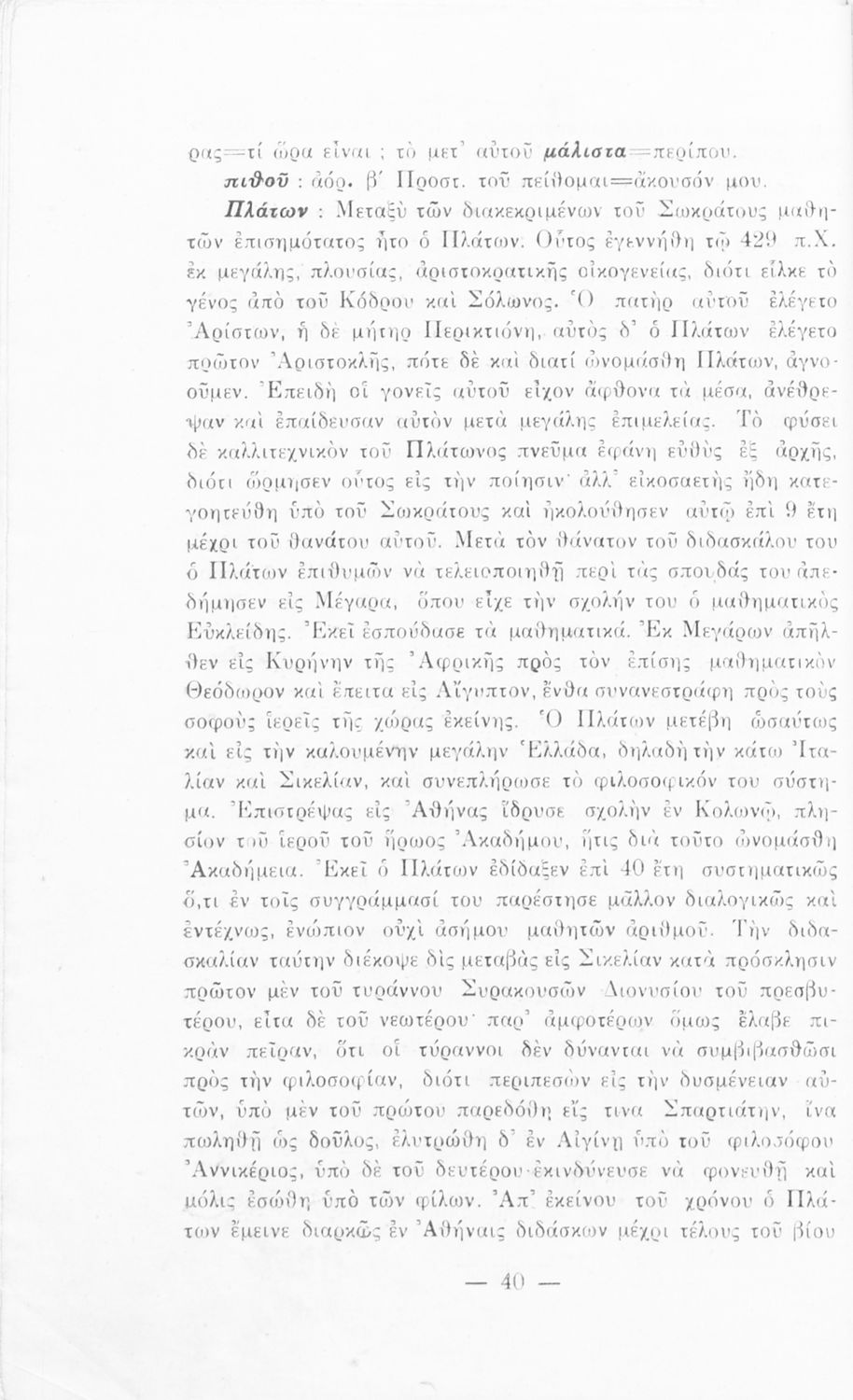Σχολικό εγχειρίδιο Αρχαίων Ελληνικών της Ε΄ Γυμνασίου που περιέχει σύντομη εισαγωγή στη ζωή και το έργο του Πλάτωνα και του Σωκράτη, κείμενο και ερμηνευτικές και πραγματολογικές σημειώσεις.