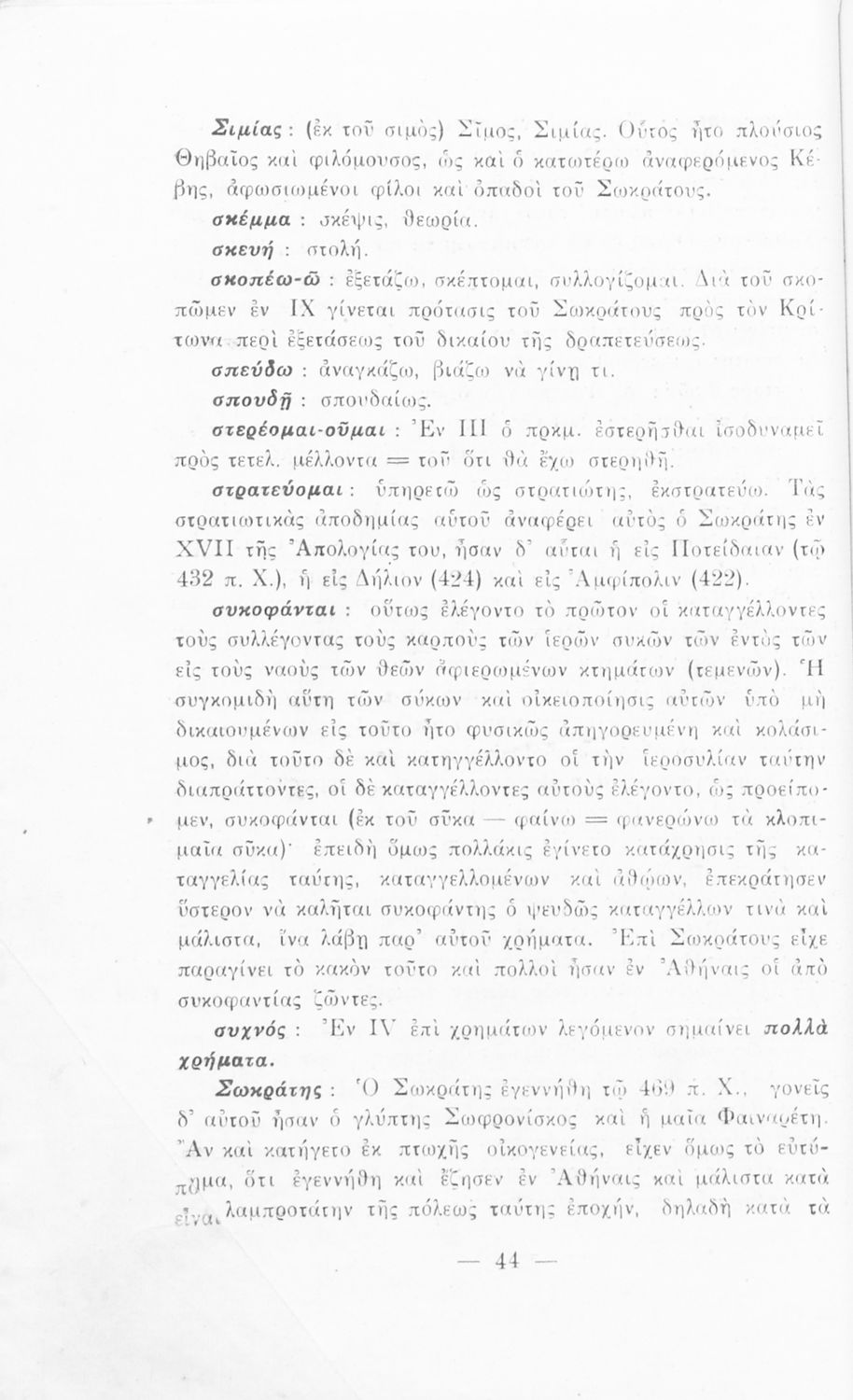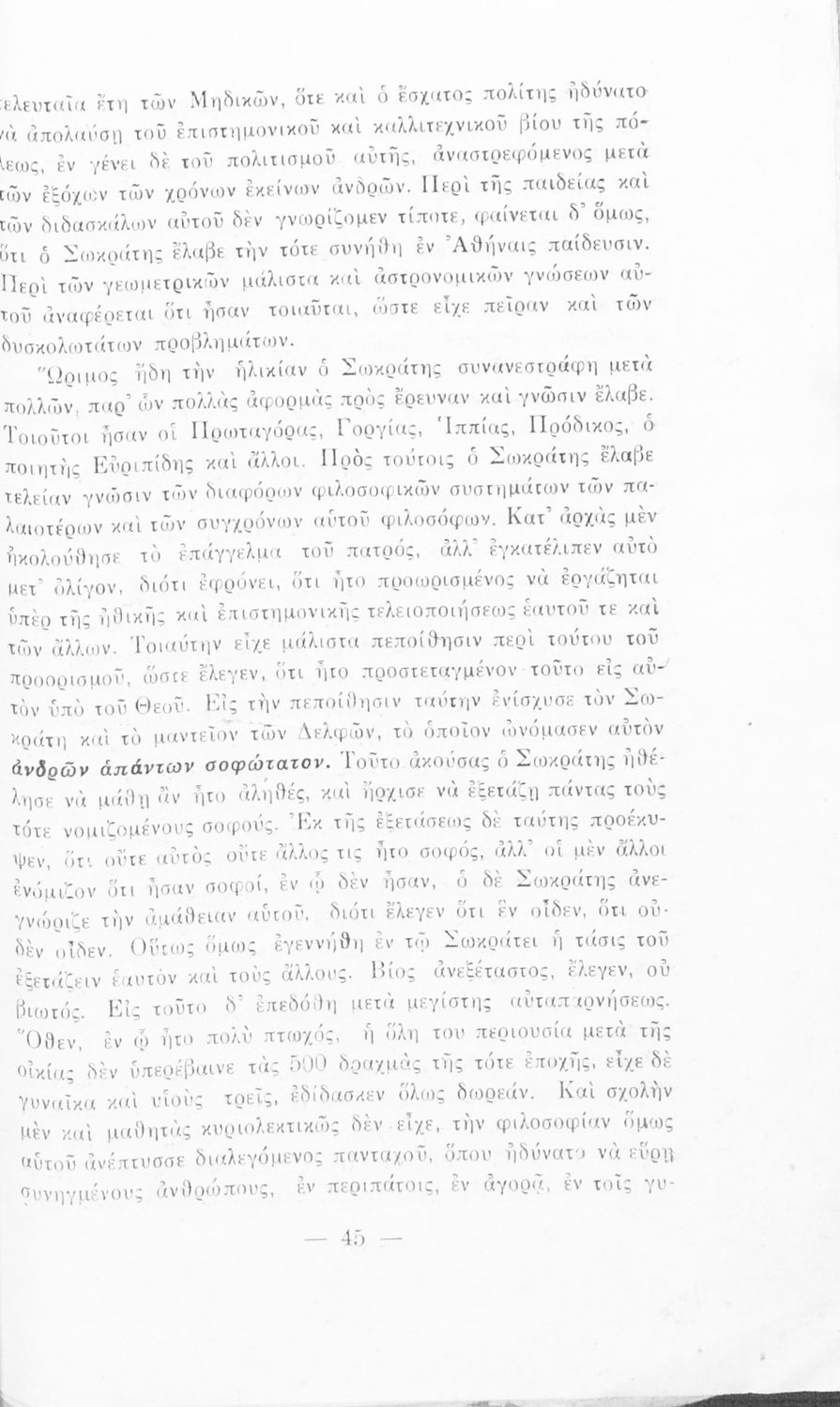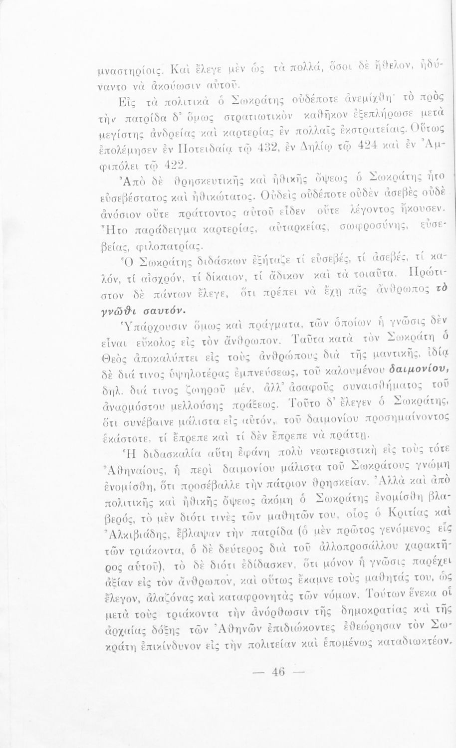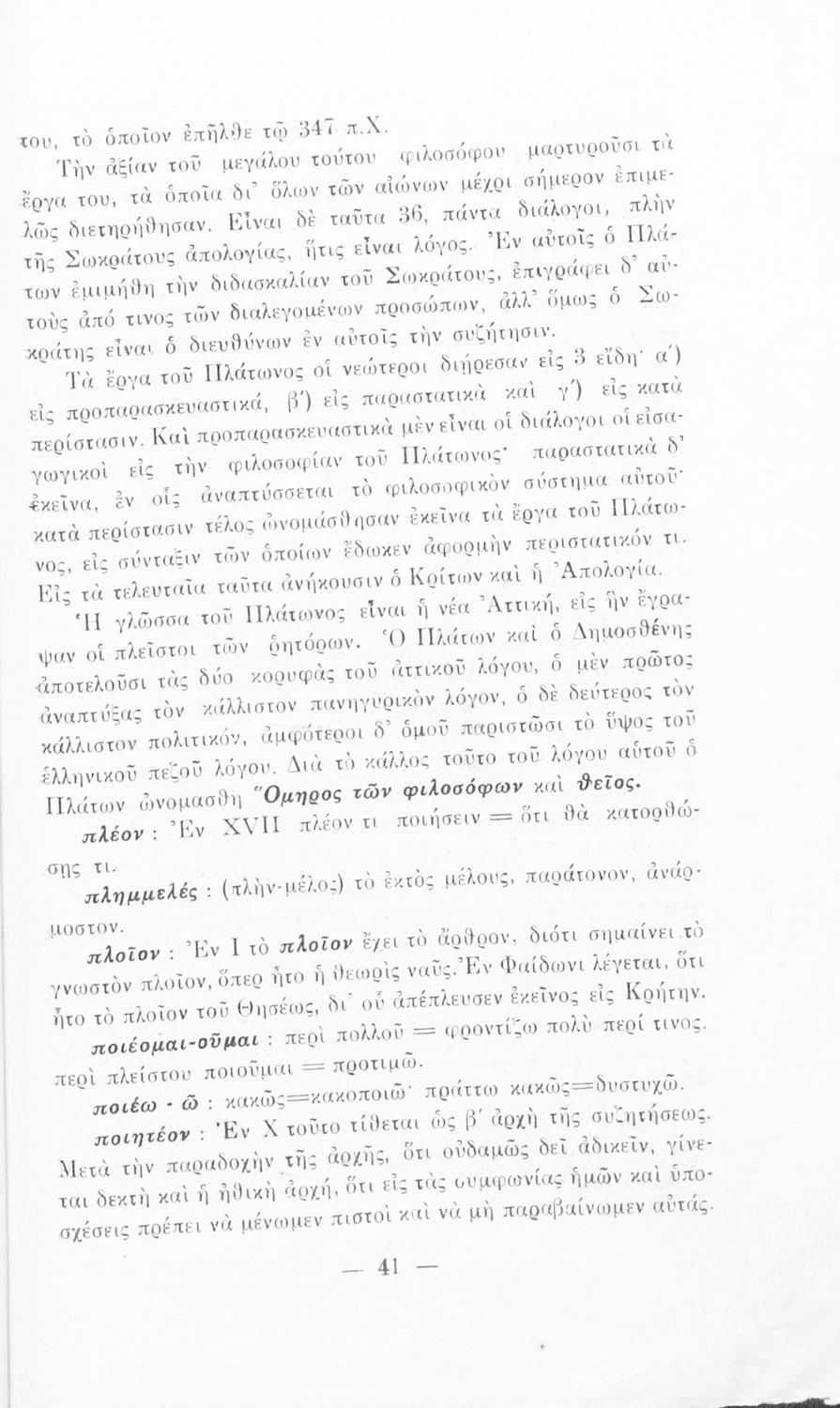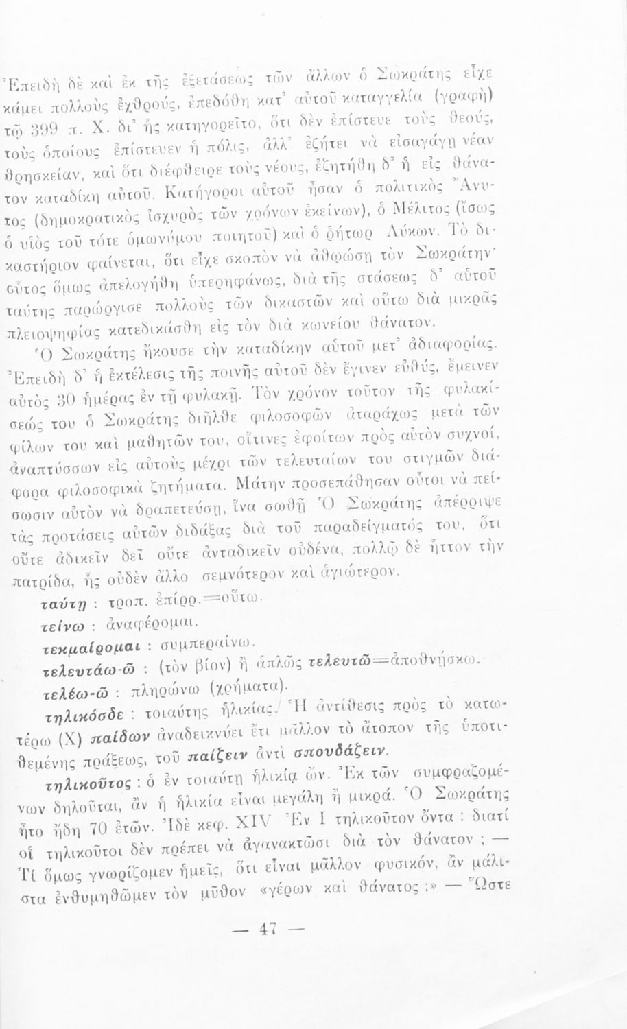 Μαθητικό βοήθημα Αρχαίων Ελληνικών της Γ΄ τάξης των τετρατάξιων Γυμνασίων. Το βιβλίο περιέχει σε μετάφραση το έργο του Πλάτωνα Απολογία του Σωκράτη.
