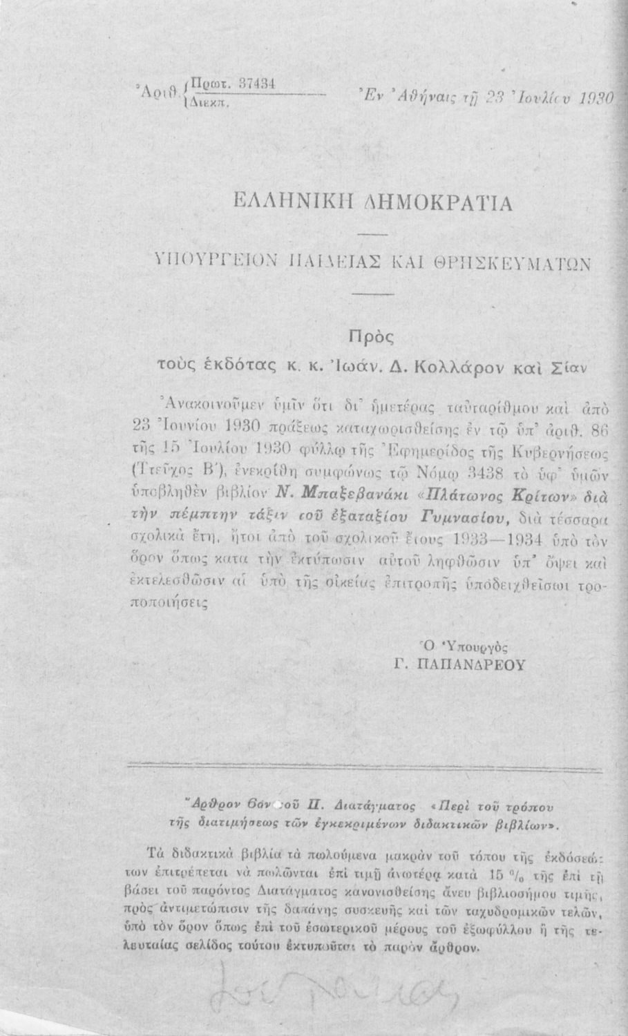 Υπουργική απόφαση / Σύμβαση: 87434/23-7-1930