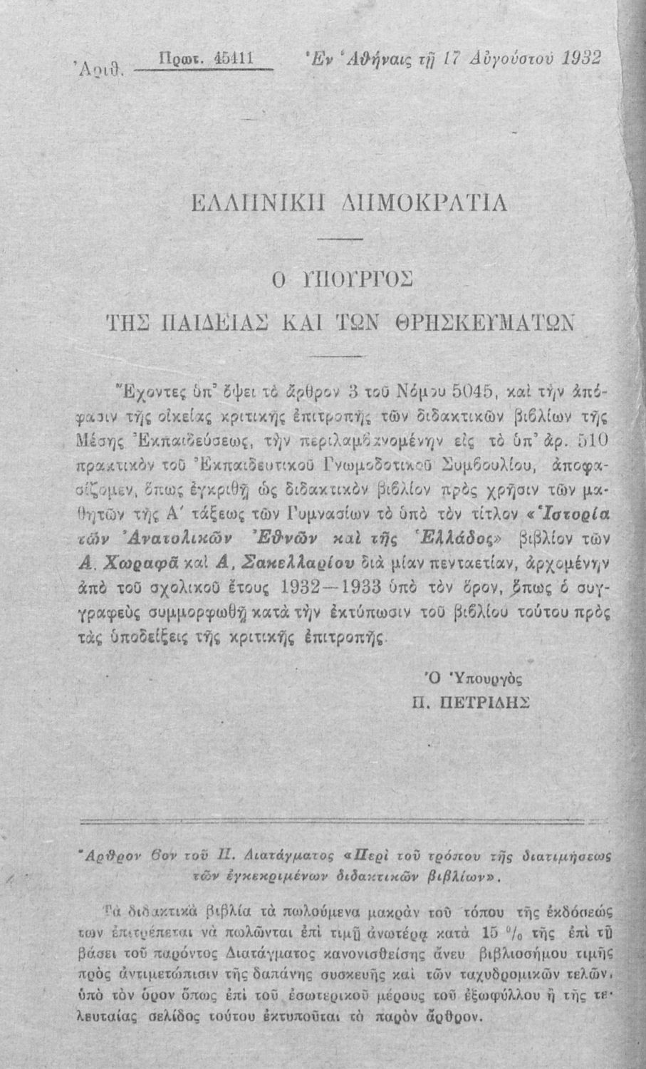 Κωδικός αναγνώρισης: 02-01350 Τίτλος: Ιστορία των ανατολικών εθνών και της Ελλάδος μέχρι του τέλους του Ε΄ π. Χ. αιώνος. Διά την Α΄ τάξιν των Γυμνασίων Συγγραφέας: Αντώνιος Χωραφάς, Αντώνιος Σακελλαρίου Μέγεθος και υπόστρωμα: Σχολικό εγχειρίδιο, μαλακό εξώφυλλο, 150 σελίδες. Εικόνες (ασπρόμαυρες), σκίτσα (ασπρόμαυρα), χάρτες (ασπρόμαυροι). |