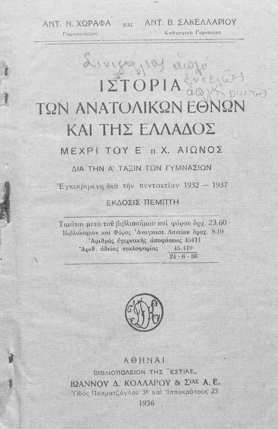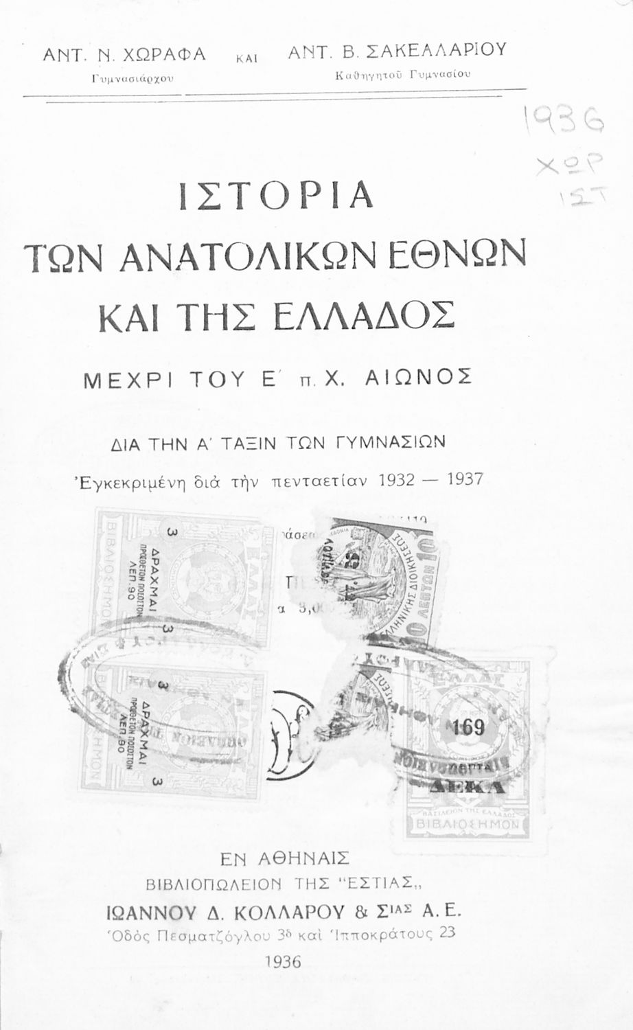 Κωδικός αναγνώρισης: 02-01350 Τίτλος: Ιστορία των ανατολικών εθνών και της Ελλάδος μέχρι του τέλους του Ε΄ π. Χ. αιώνος. Διά την Α΄ τάξιν των Γυμνασίων Συγγραφέας: Αντώνιος Χωραφάς, Αντώνιος Σακελλαρίου Μέγεθος και υπόστρωμα: Σχολικό εγχειρίδιο, μαλακό εξώφυλλο, 150 σελίδες. Εικόνες (ασπρόμαυρες), σκίτσα (ασπρόμαυρα), χάρτες (ασπρόμαυροι). |