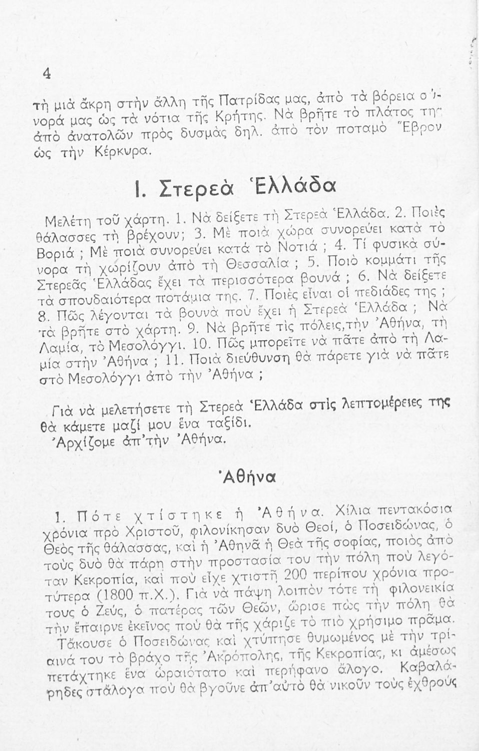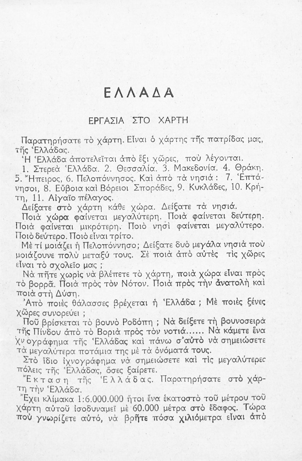 Μαθητικό βοήθημα Γεωγραφίας Γ΄ και Δ΄ Δημοτικού που αποτελεί μια γενική επισκόπηση της Ελλάδας ανά διαμέρισμα και νομό. Περιέχει και στατιστικούς πίνακες.
