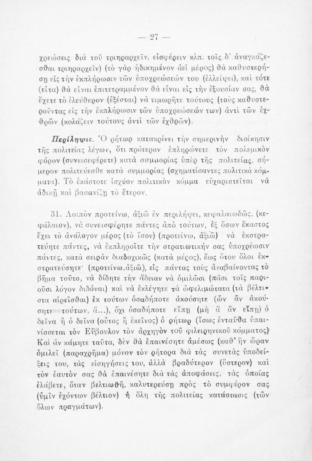 Σχολικό εγχειρίδιο Αρχαίων Ελληνικών Δ΄ Γυμνασίου που περιλαμβάνει εισαγωγή στη ζωή και στο έργο του Δημοσθένη, τον Α΄ κατά Φιλίππου, και τους Α΄ και Β΄ Ολυνθιακούς και ερμηνευτικά και ετυμολογικά σχόλια.