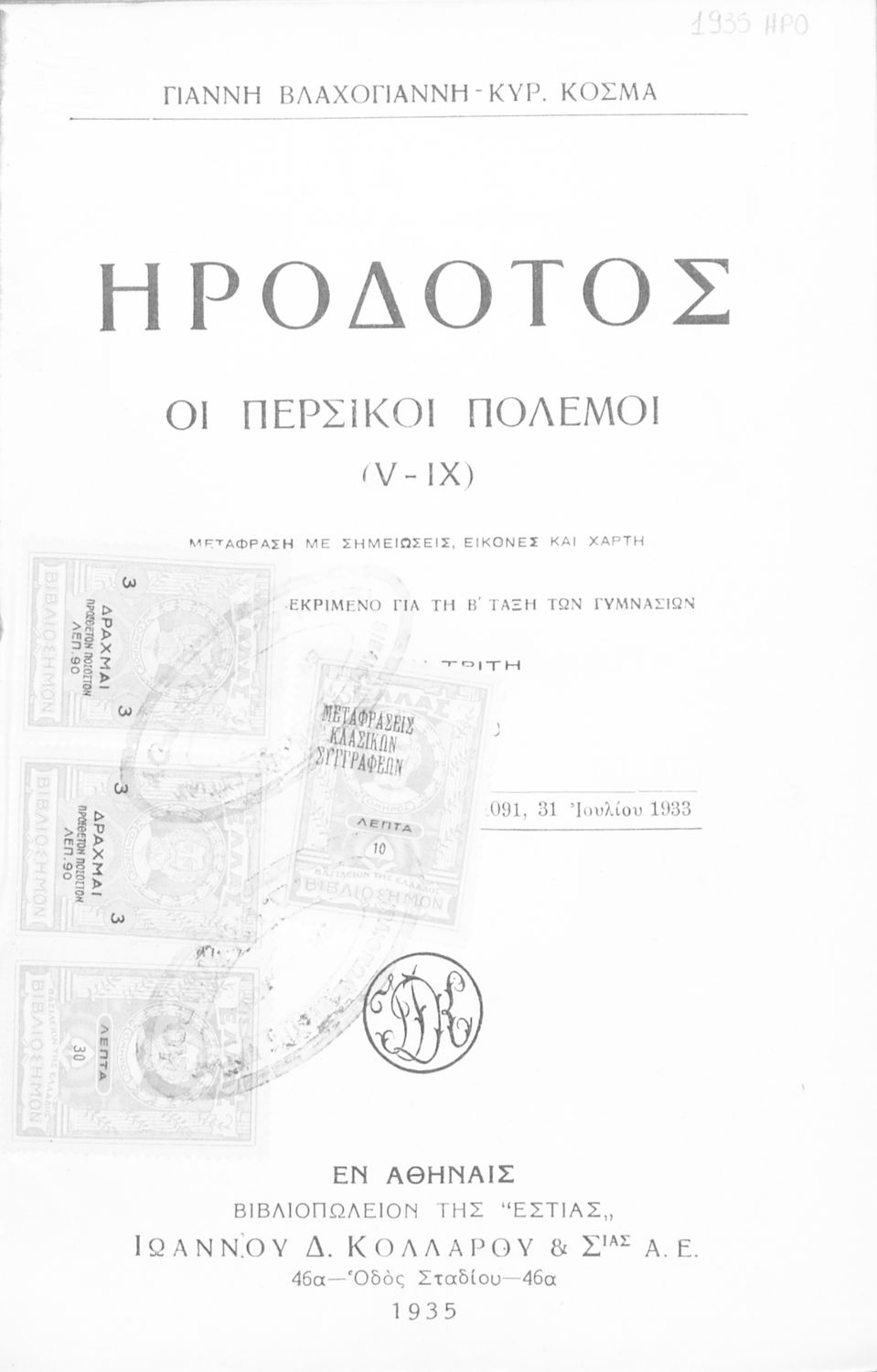 Εκδότης: Ιωάννης Δ. Κολλάρος και ΣΙΑ ΑΕ Έτος έκδοσης: 1935 Τόπος έκδοσης: Αθήνα Έκδοση: 3η Υπουργική απόφαση / Σύμβαση: 41091/31-7-1933 |