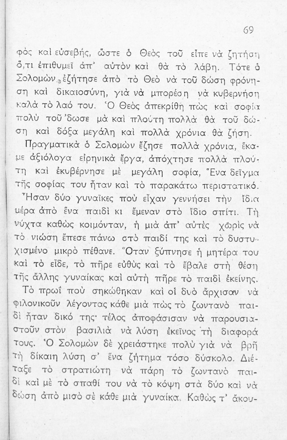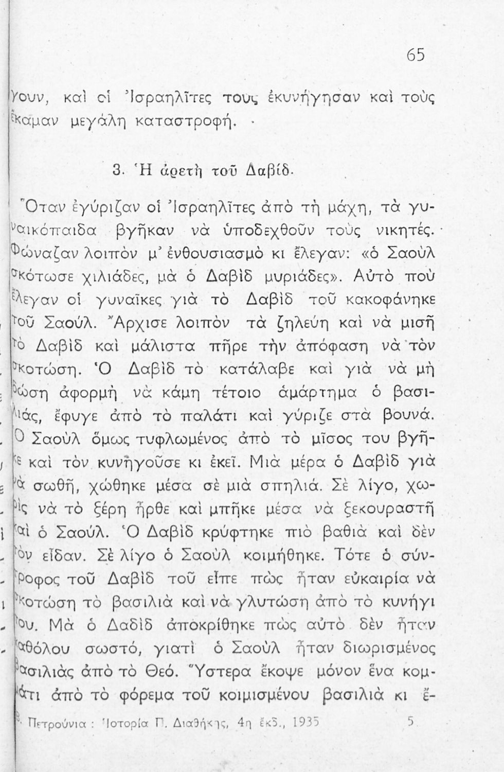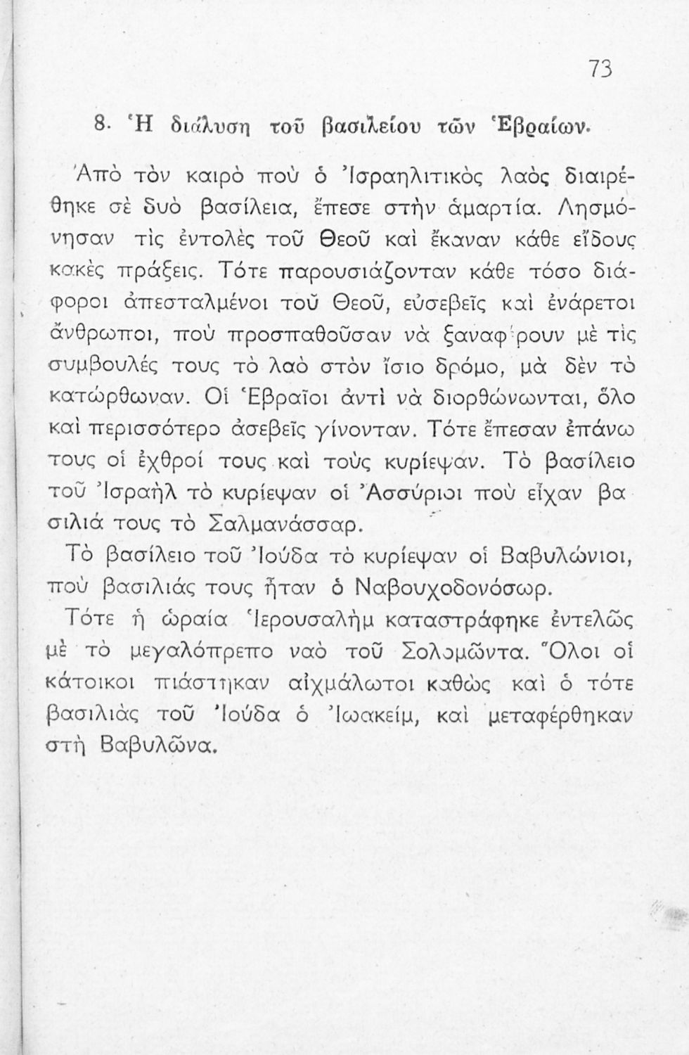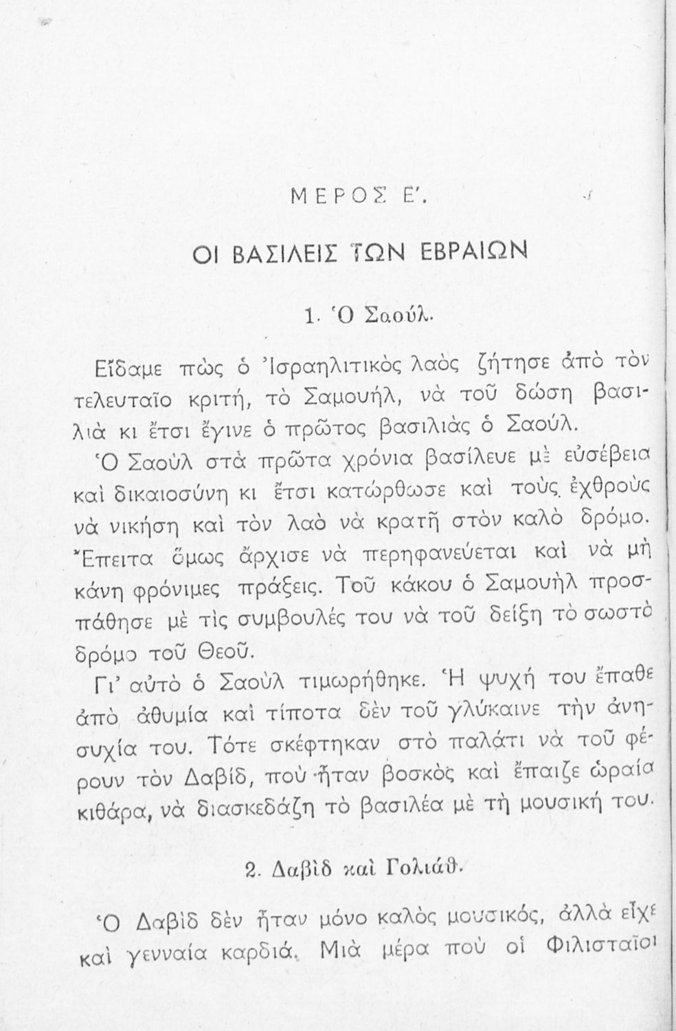 Σχολικό εγχειρίδιο Θρησκευτικών που συνιστά μία εξιστόρηση της Παλαιάς Διαθήκης από τη δημιουργία του κόσμου ως την υποταγή των Εβραίων στους Ρωμαίους. Περιέχει και στοιχεία γεωγραφίας της Παλαιστίνης.