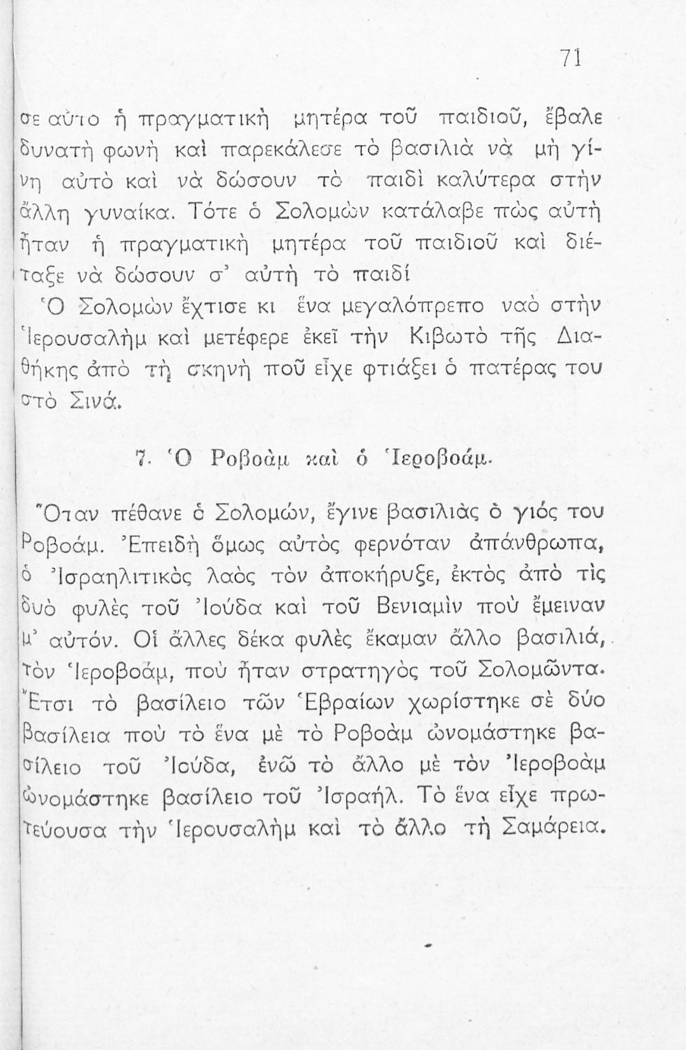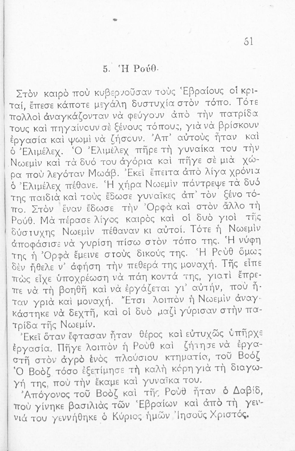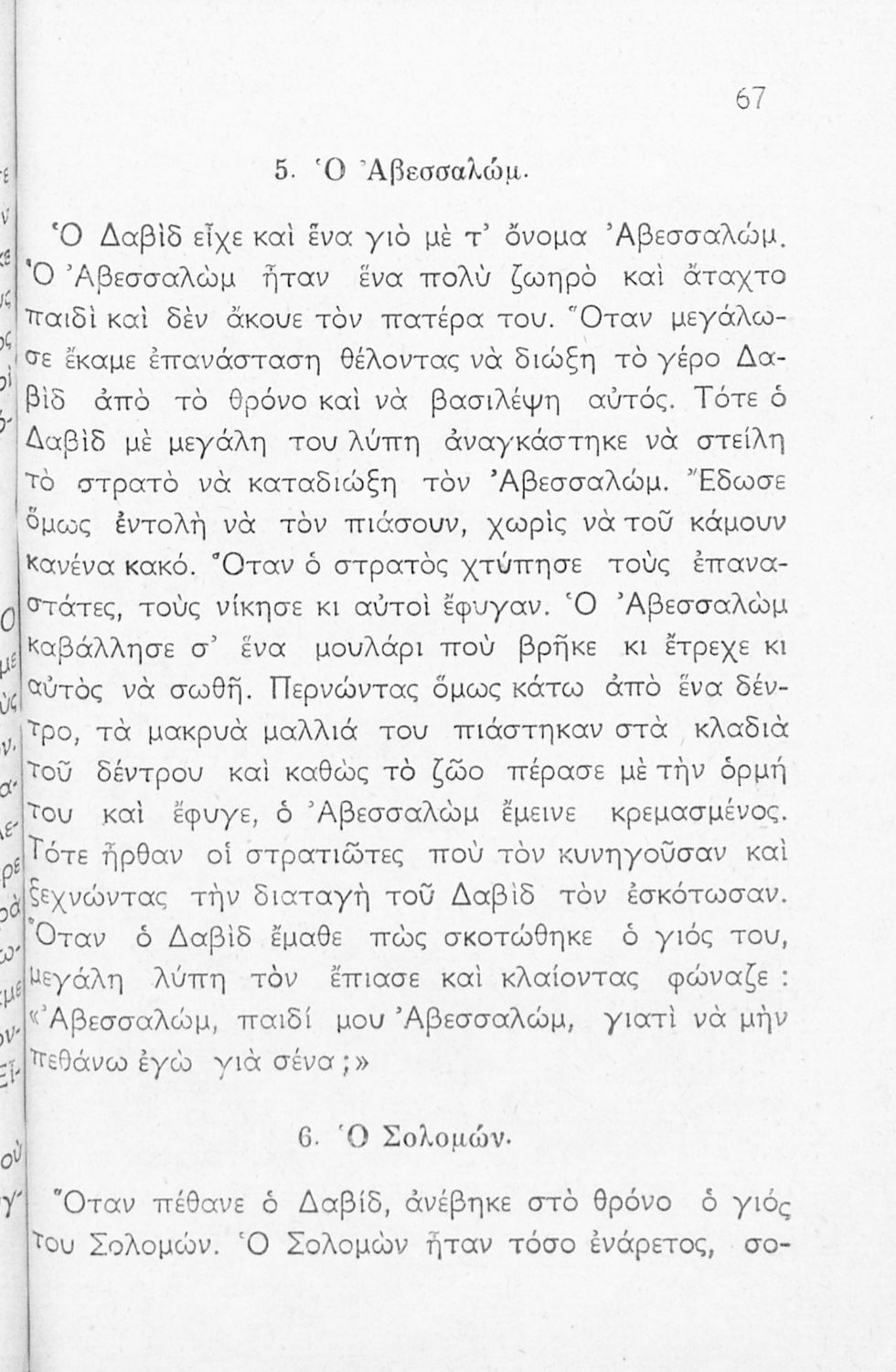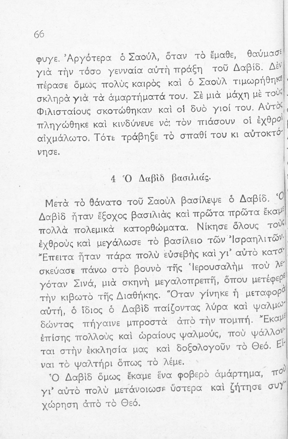 Σχολικό εγχειρίδιο Θρησκευτικών που συνιστά μία εξιστόρηση της Παλαιάς Διαθήκης από τη δημιουργία του κόσμου ως την υποταγή των Εβραίων στους Ρωμαίους. Περιέχει και στοιχεία γεωγραφίας της Παλαιστίνης.