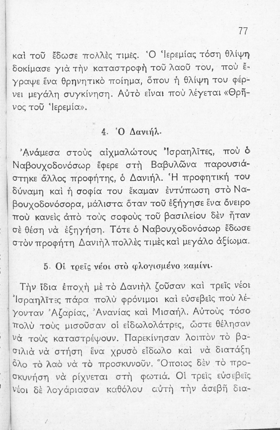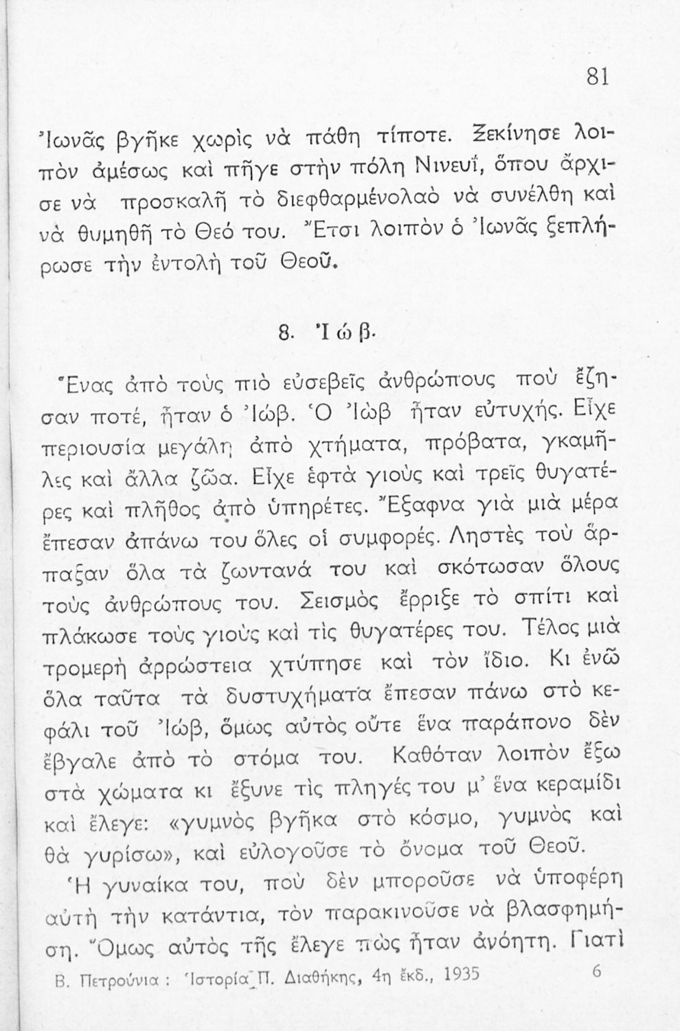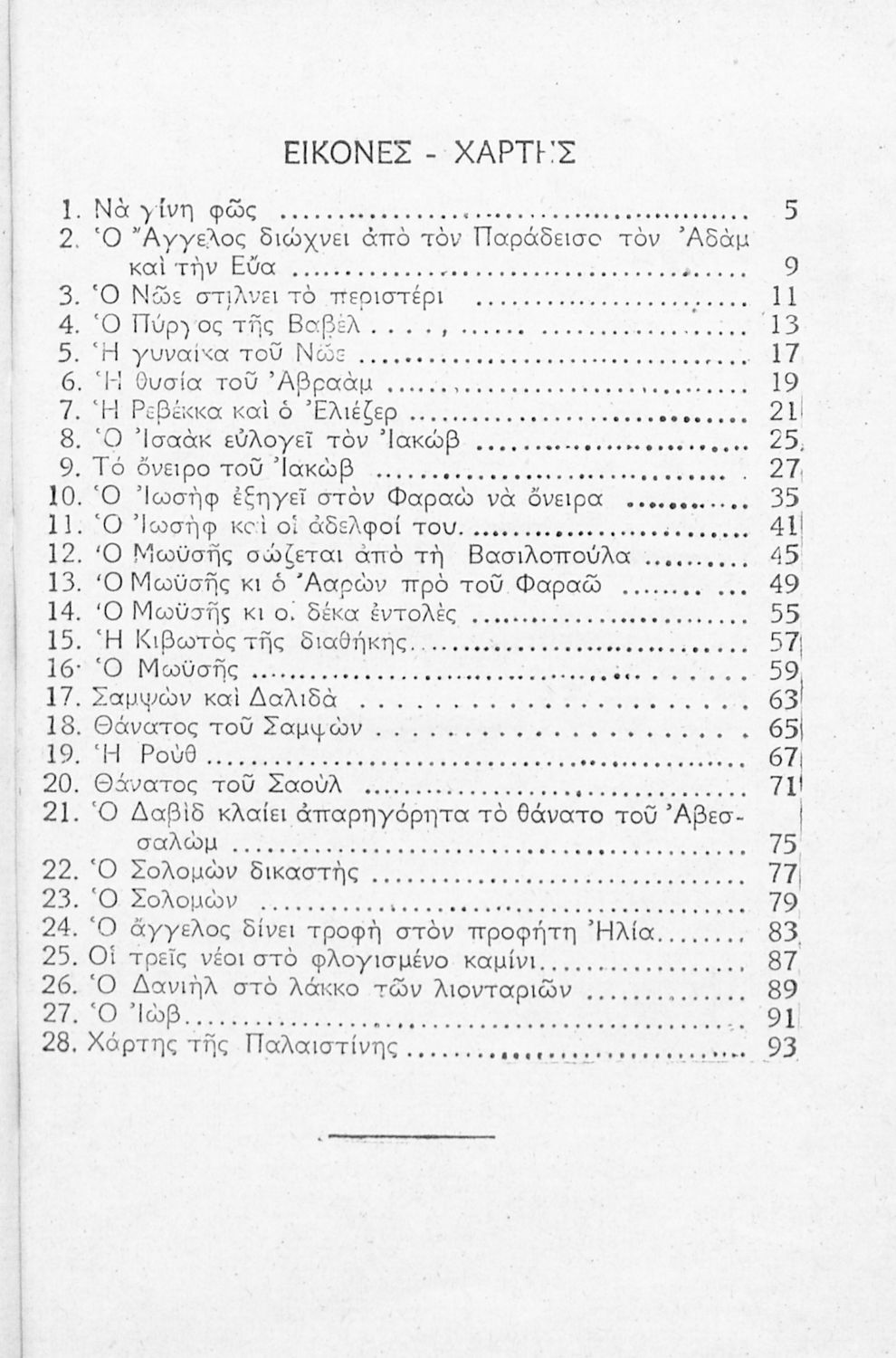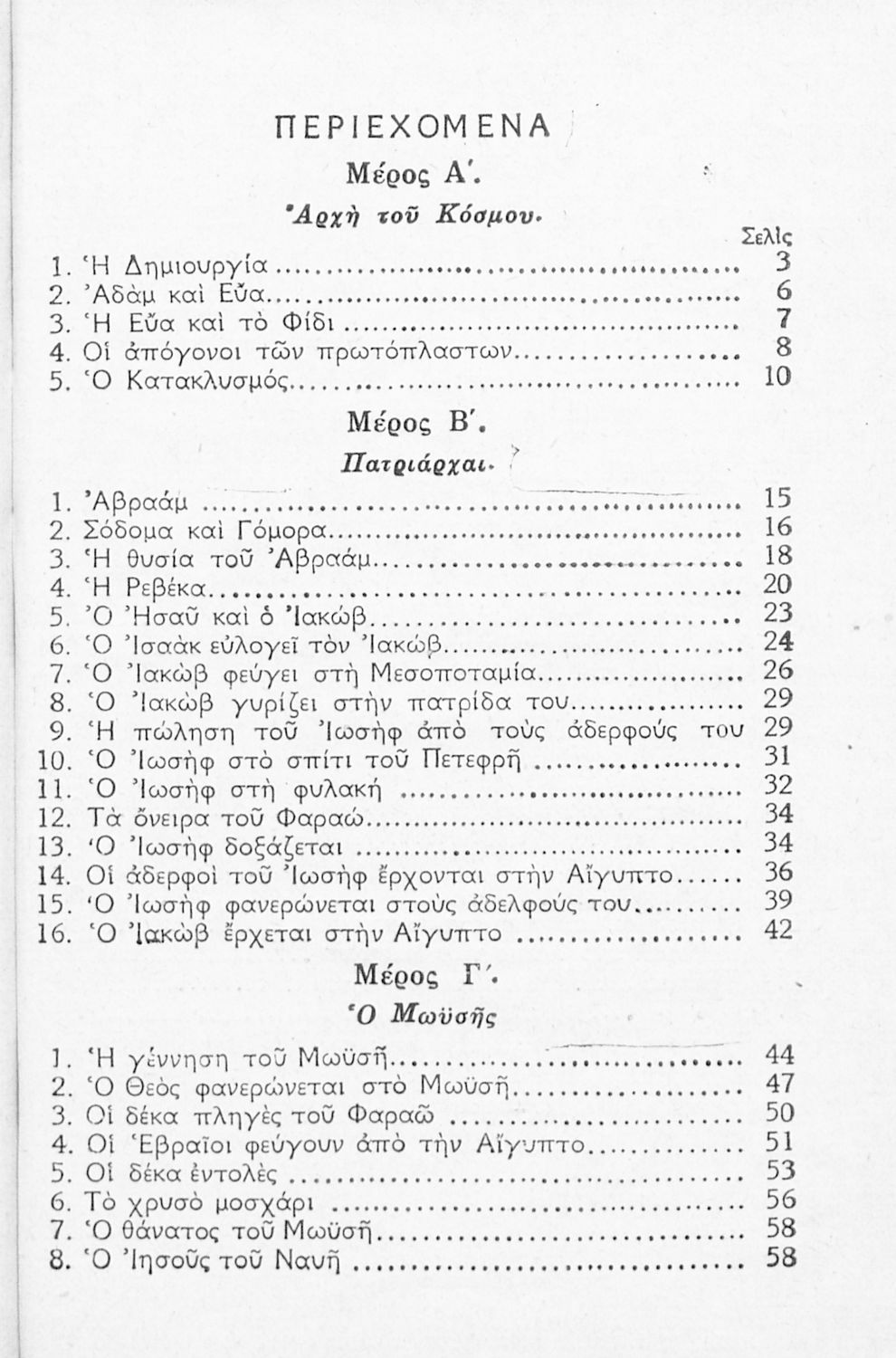 Σχολικό εγχειρίδιο Θρησκευτικών που συνιστά μία εξιστόρηση της Παλαιάς Διαθήκης από τη δημιουργία του κόσμου ως την υποταγή των Εβραίων στους Ρωμαίους. Περιέχει και στοιχεία γεωγραφίας της Παλαιστίνης.