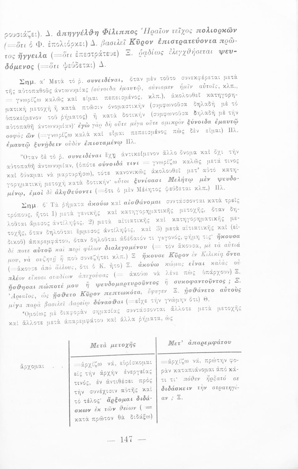 Σχολικό Εγχειρίδιο Αρχαίων Ελληνικών που περιλαμβάνει κείμενα προσαρμοσμένα στη διδασκαλία των γραμματικών και συντακτικών φαινομένων, και ερμηνευτικές και λεξιλογικές σημειώσεις.