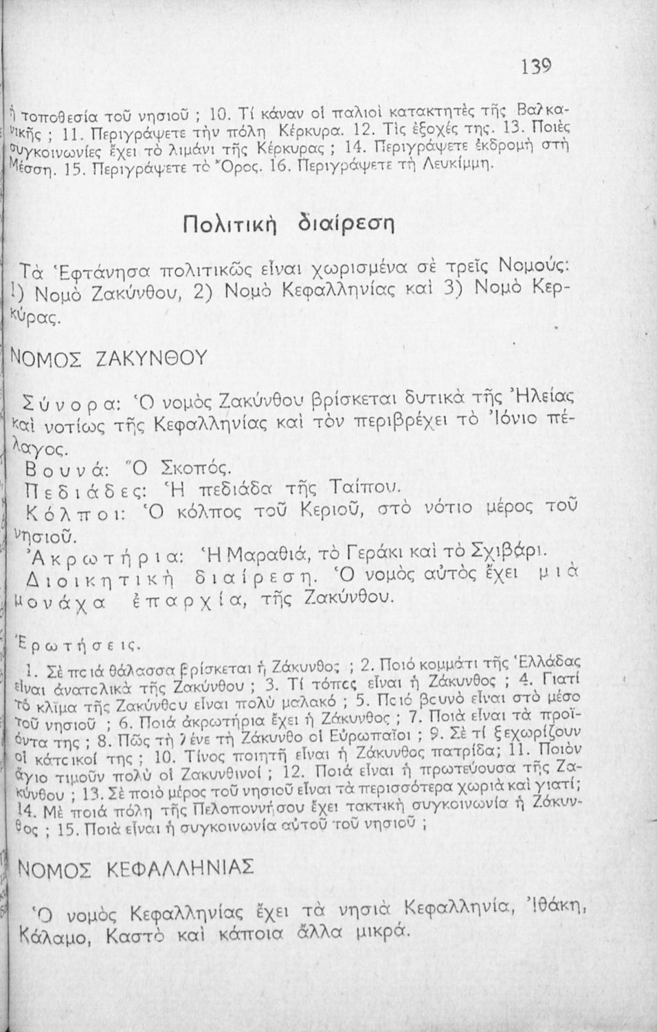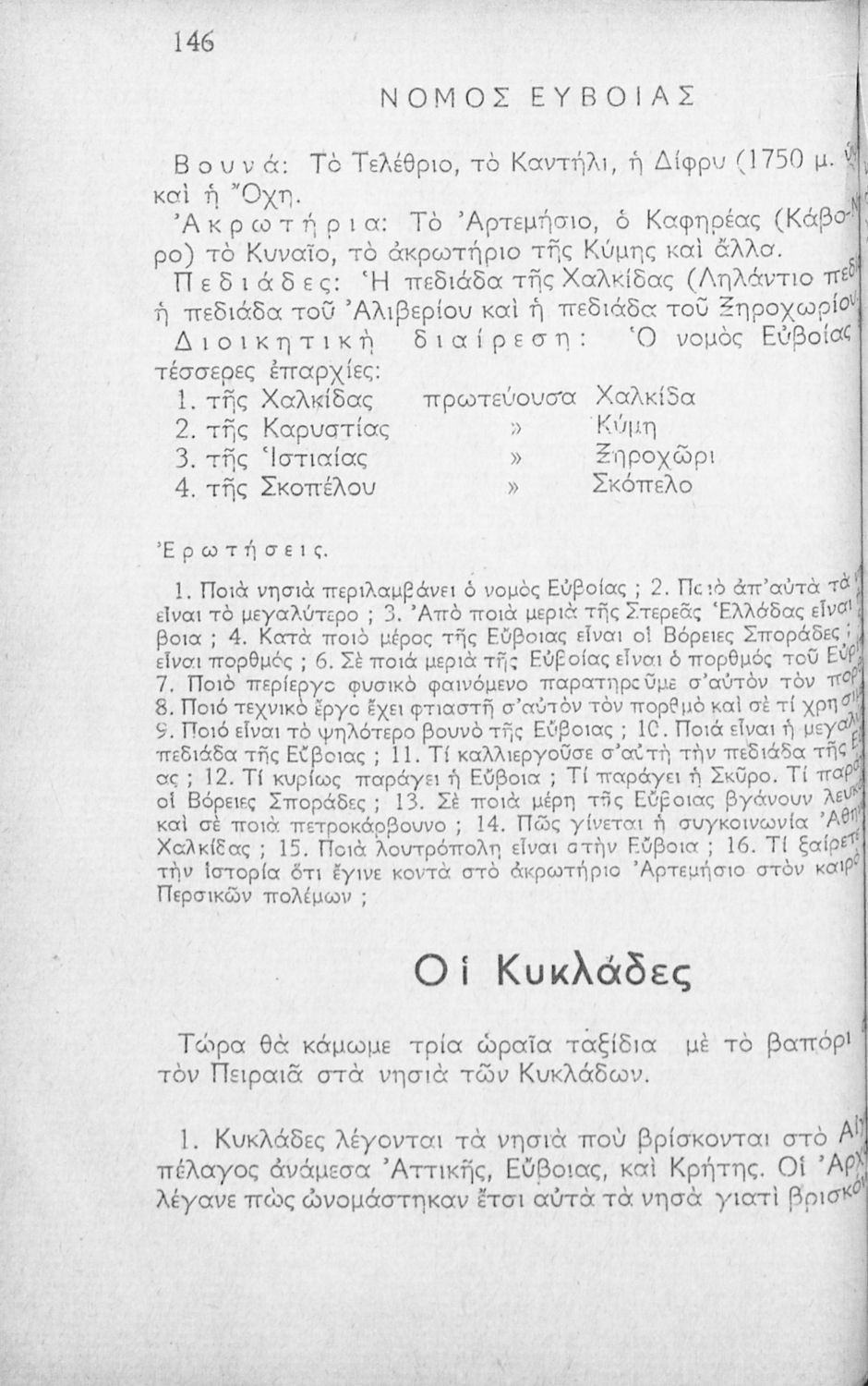 Σχολικό εγχειρίδιο Γεωγραφίας για τη Γ΄, Δ΄ Δημοτικού. Μελετά την Ελλάδα ανά γεωγραφικό νομό με πληροφορίες από το χάρτη της περιοχής και στοιχεία της ιστορίας και της οικονομικής ζωής.
