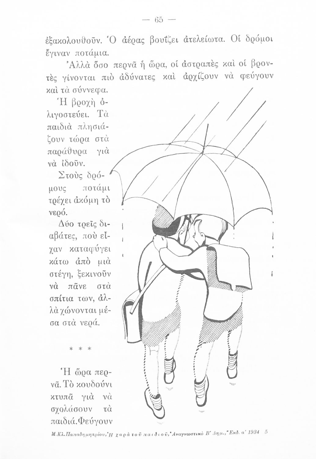 Αναγνωστικό Β' Δημοτικού που περιλαμβάνει μικρά διηγήματα και ποιήματα με περιεχόμενο από την οικογενειακή και κοινωνική ζωή, την ελληνική φύση, την ελληνική ιστορία και μυθολογία και την υγιεινή.