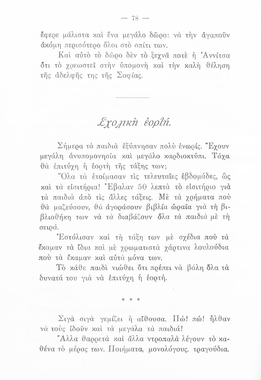 Αναγνωστικό Β΄ Δημοτικού που περιέχει πεζά και ποιήματα εμπνευσμένα από την θρησκευτική, κοινωνική, οικογενειακή ζωή. Διαθέτει εικόνες που διευκολύνουν τη μάθηση. Πρόκειται για επανέκδοση από τη συλλογή της εφημερίδας Βήμα το 2013.