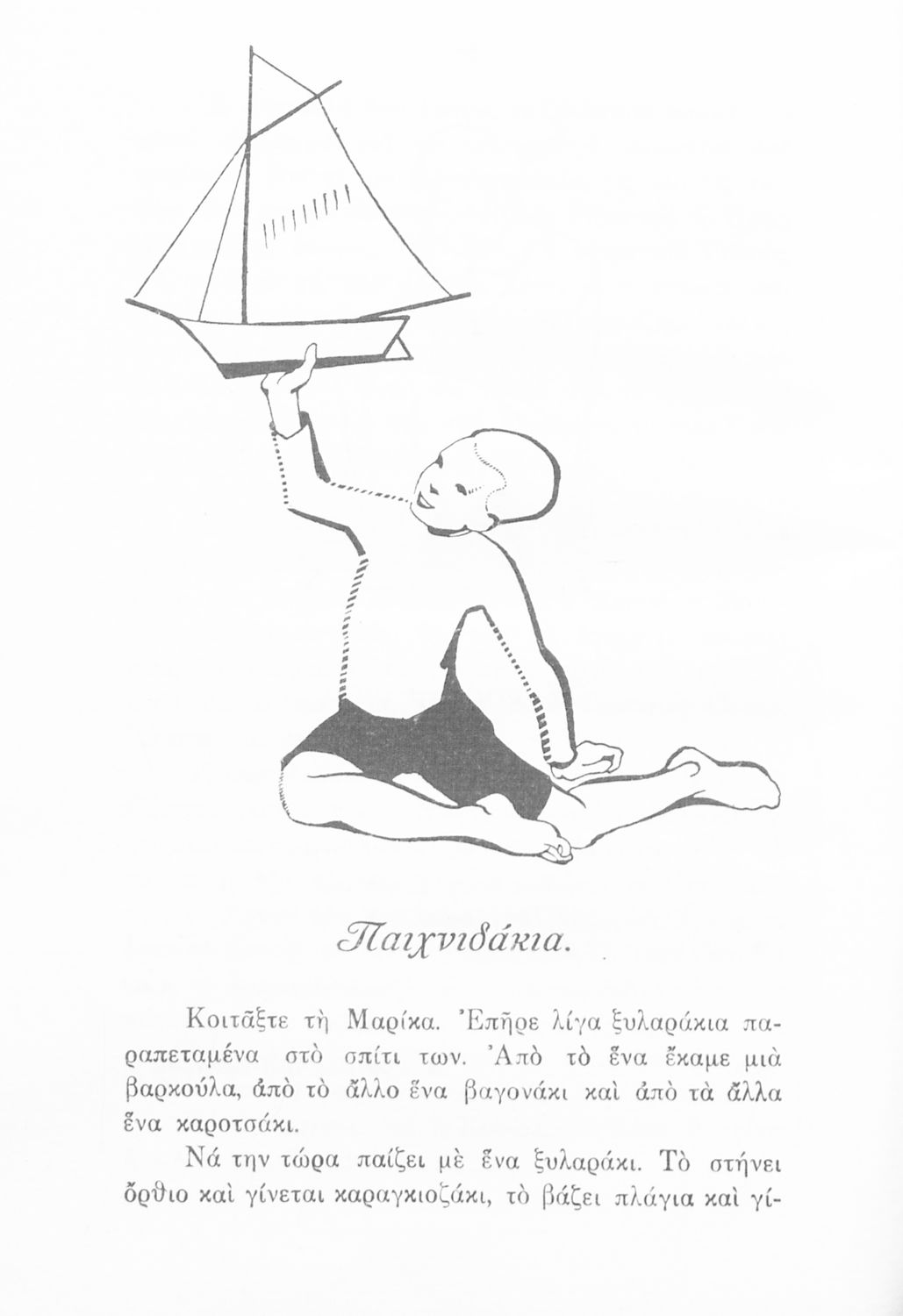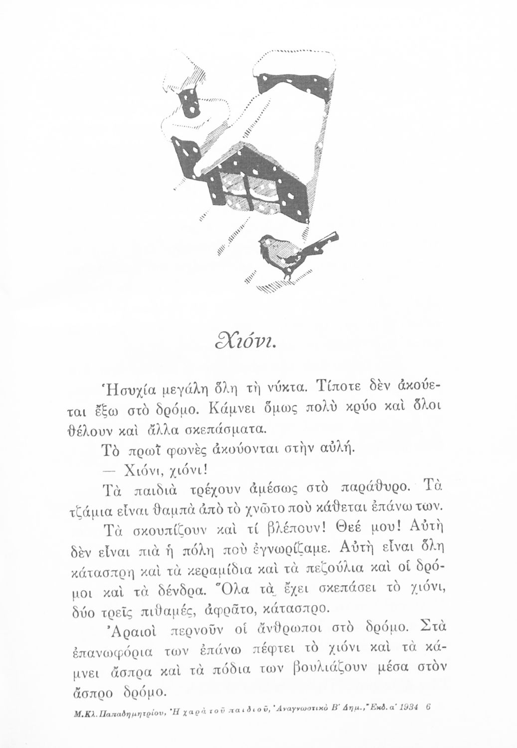 Αναγνωστικό Β' Δημοτικού που περιλαμβάνει μικρά διηγήματα και ποιήματα με περιεχόμενο από την οικογενειακή και κοινωνική ζωή, την ελληνική φύση, την ελληνική ιστορία και μυθολογία και την υγιεινή.
