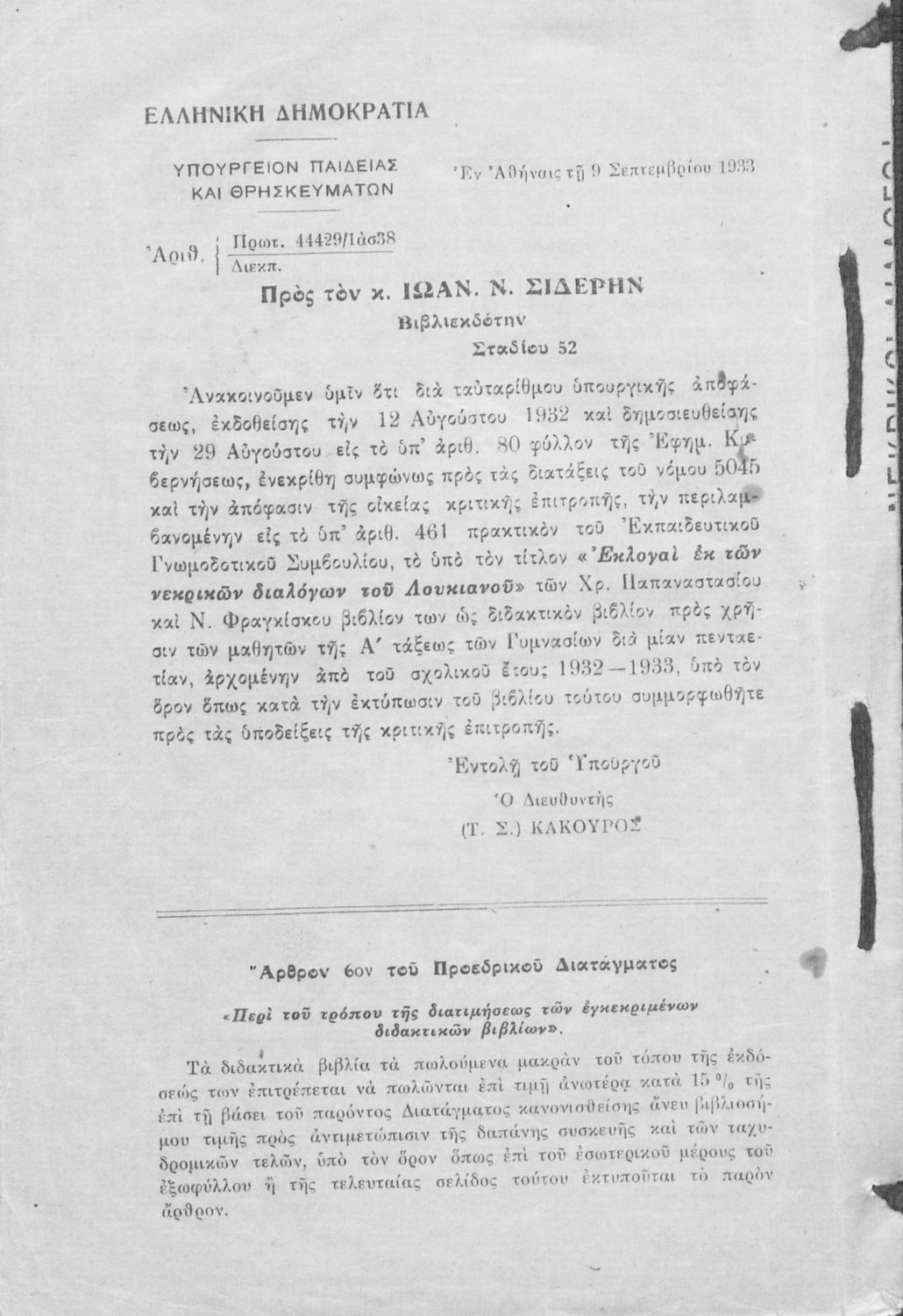 Υπουργική απόφαση / Σύμβαση: 44429/9-9-1933