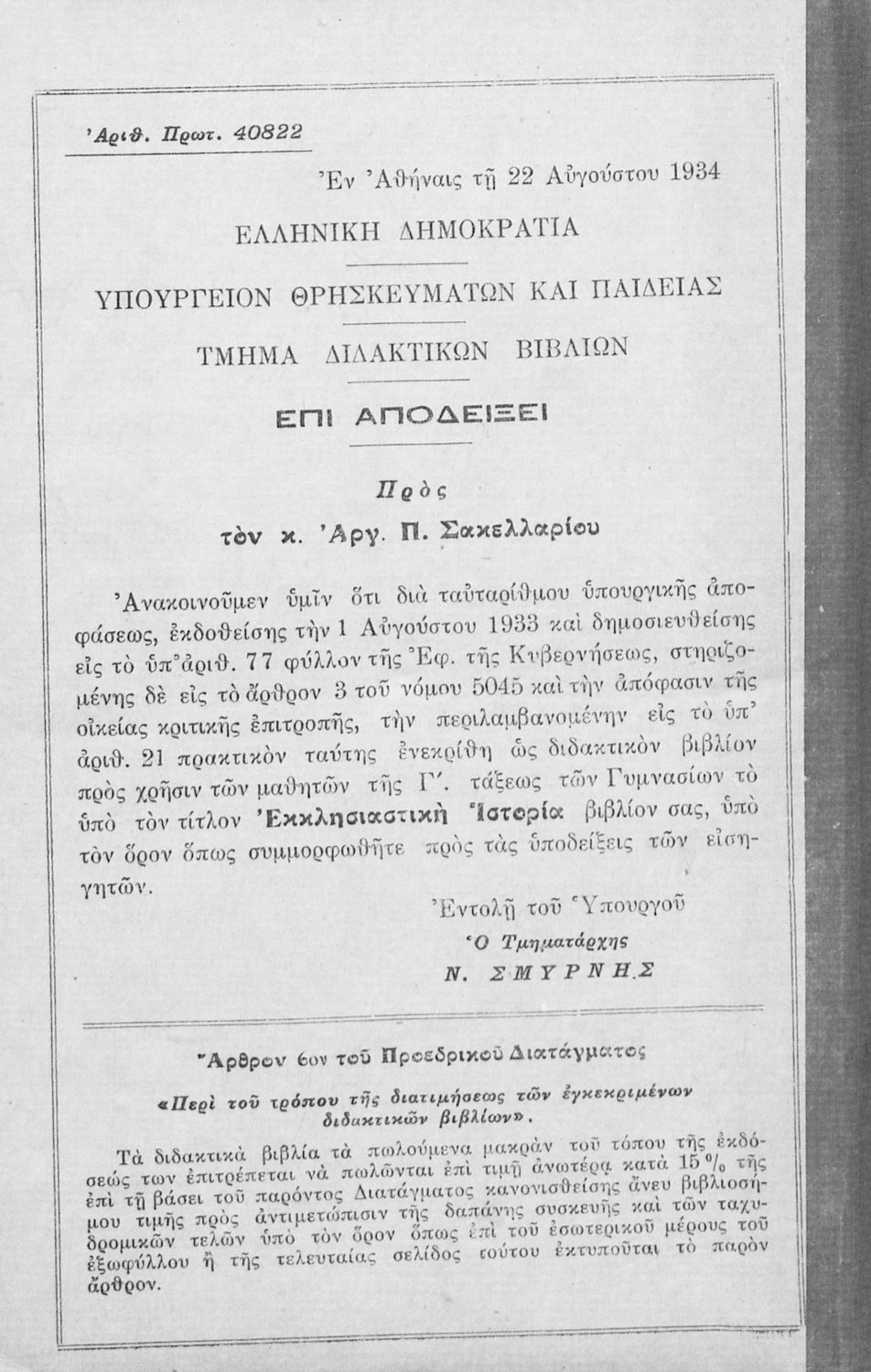 Υπουργική απόφαση / Σύμβαση: 40822/22-8-1934