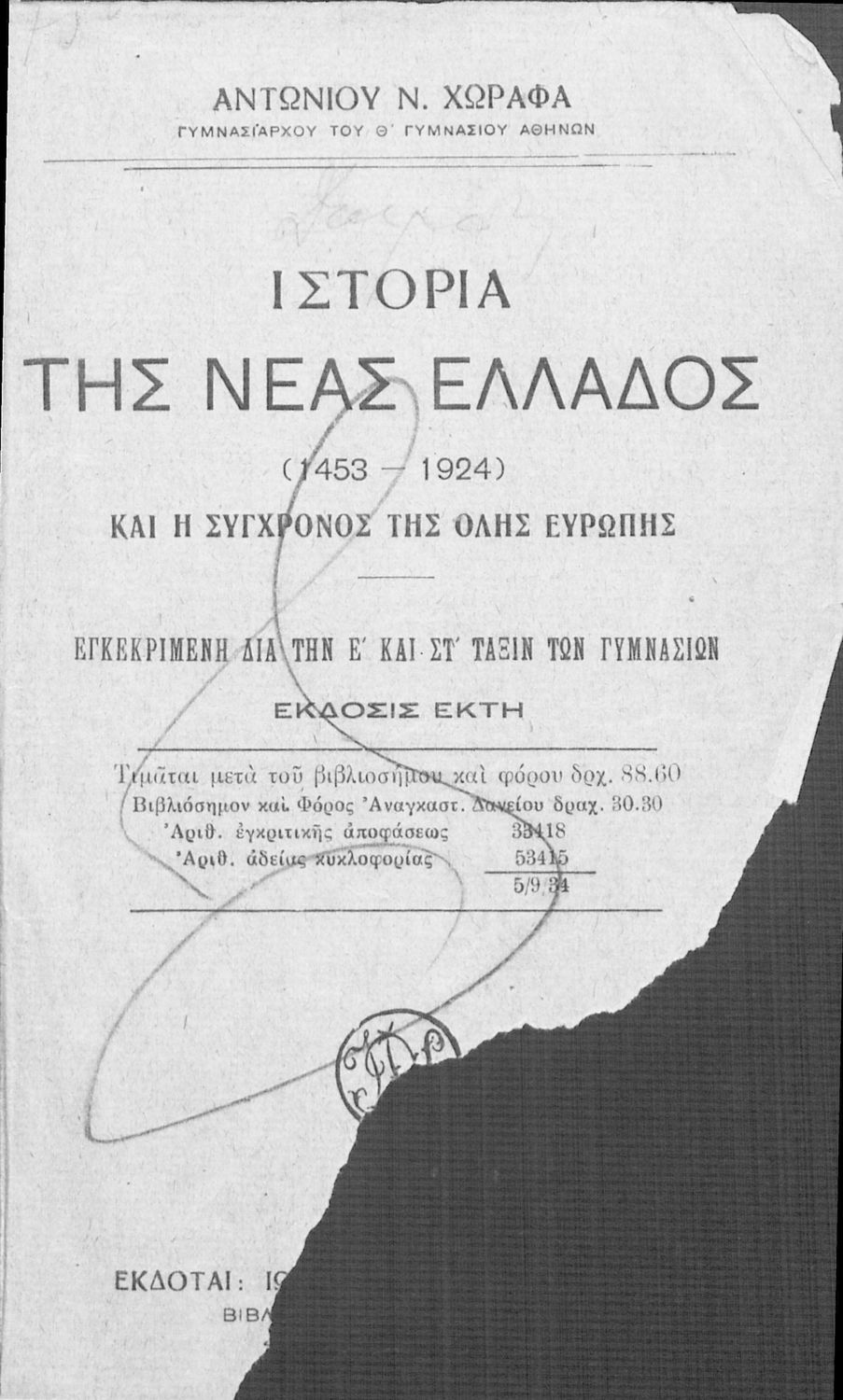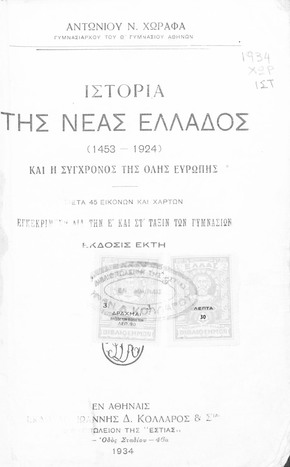 Κωδικός αναγνώρισης: 02-01417 Τίτλος: Ιστορία της Νέας Ελλάδος (1453-1924) και η σύγχρονος της όλης Ευρώπης δια την Ε΄ και ΣΤ΄ τάξιν των Γυμνασίων Συγγραφέας: Χωραφάς Αντώνιος Μέγεθος και υπόστρωμα: Σχολικό εγχειρίδιο, σκληρό εξώφυλλο, 412 σελίδες. Εικόνες (ασπρόμαυρες), σκίτσα (ασπρόμαυρα), χάρτες (ασπρόμαυροι). |