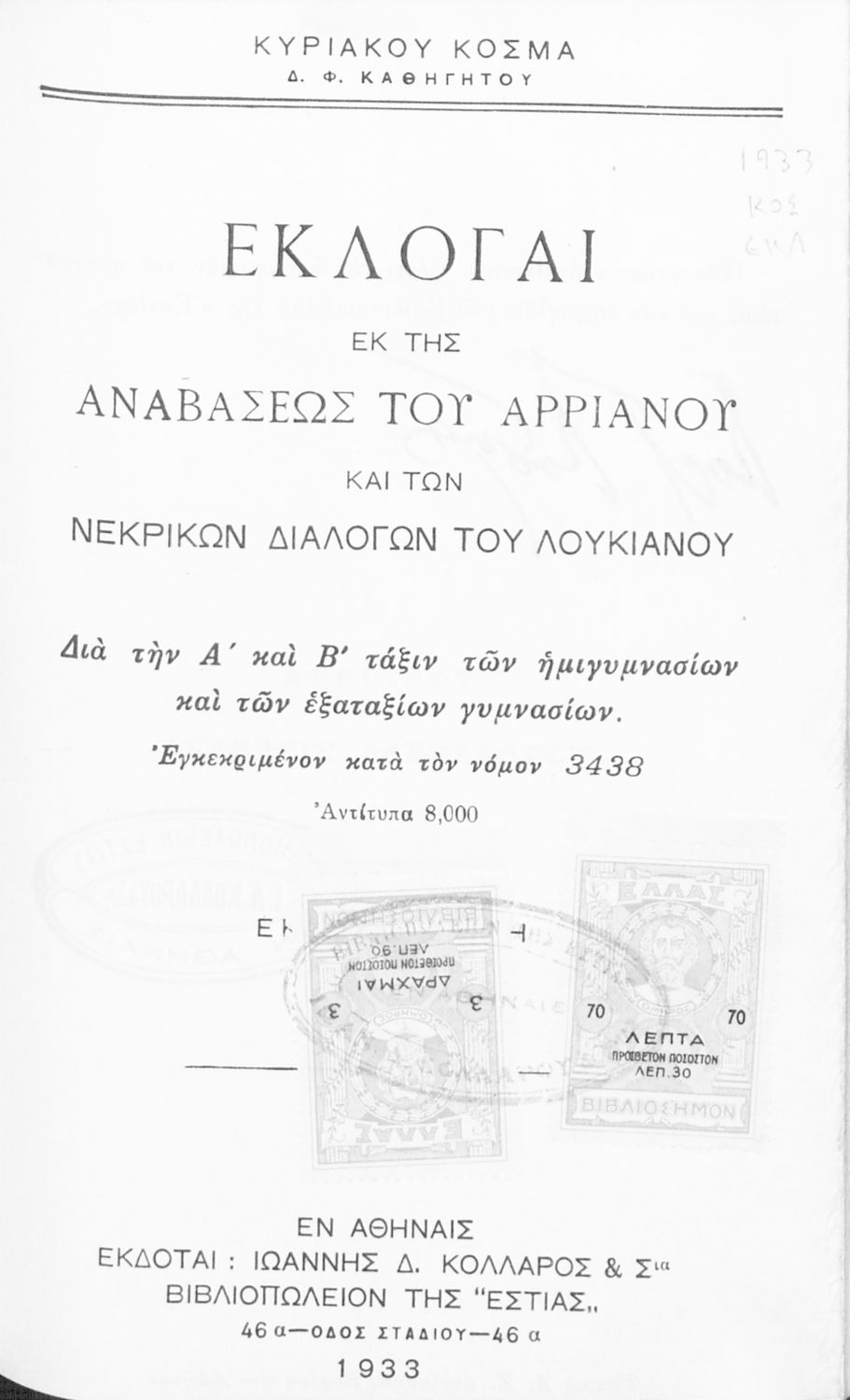 Εκδότης: Ιωάννης Δ. Κολλάρος και ΣΙΑ ΑΕ Έτος έκδοσης: 1933 Τόπος έκδοσης: Αθήνα |