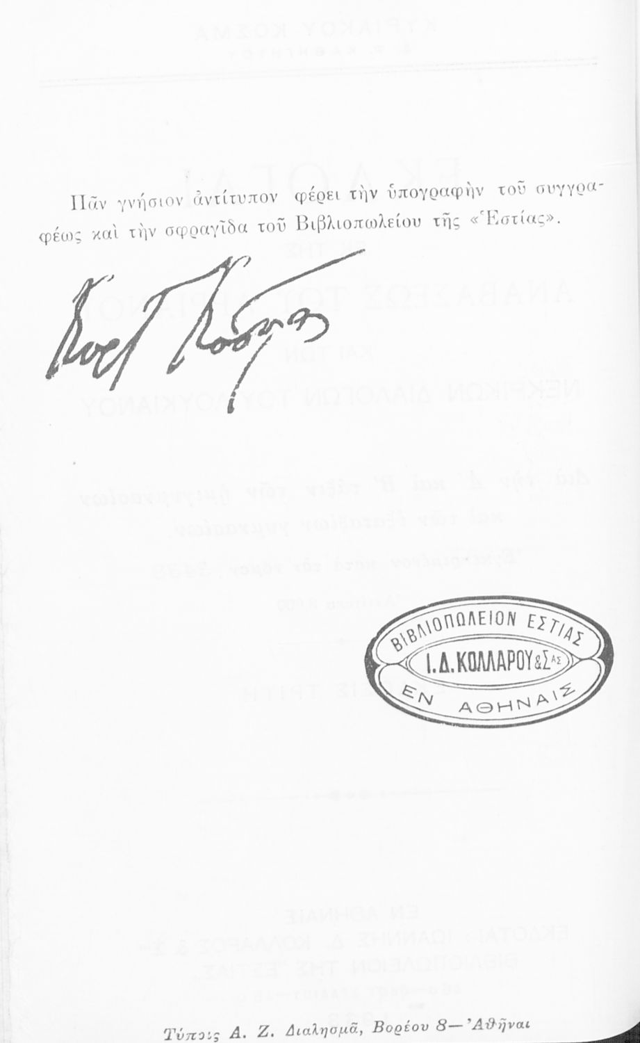 Εντοπισμός πρωτοτύπου: Ελληνικό Λογοτεχνικό και Ιστορικό Αρχείο Κωδικός βιβλιοθήκης: 1933 ΚΟΣ ΕΚΛ |