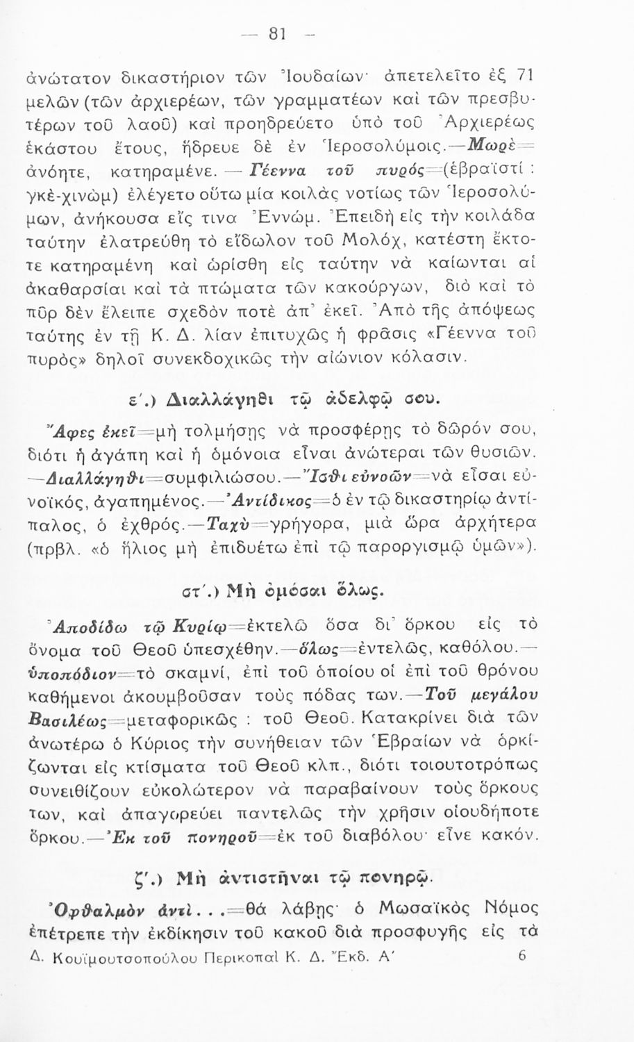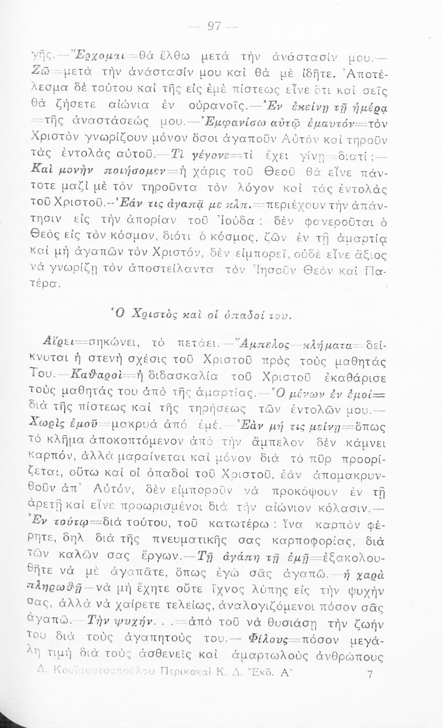 Κωδικός αναγνώρισης: 02-01441 Τίτλος: Περικοπαί εκ της Καινής Διαθήκης εγκεκριμέναι δια τους μαθητάς της Δ΄ τάξεως των Γυμνασίων και Παρθεναγωγείων Συγγραφέας: Δημήτριος Ι. Κουϊμουτσόπουλος Μέγεθος και υπόστρωμα: Σχολικό εγχειρίδιο, μαλακό εξώφυλλο, 168 σελίδες. Εικόνες (ασπρόμαυρες), σκίτσα (ασπρόμαυρα), χάρτες (ασπρόμαυροι). |