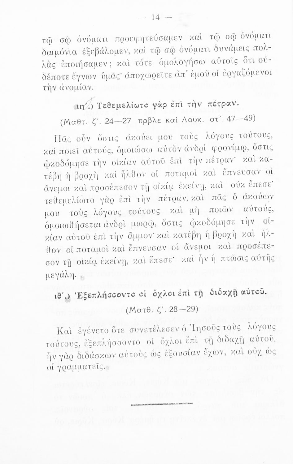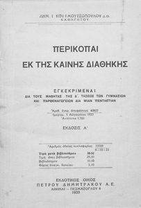 Κωδικός αναγνώρισης: 02-01441 Τίτλος: Περικοπαί εκ της Καινής Διαθήκης εγκεκριμέναι δια τους μαθητάς της Δ΄ τάξεως των Γυμνασίων και Παρθεναγωγείων Συγγραφέας: Δημήτριος Ι. Κουϊμουτσόπουλος Μέγεθος και υπόστρωμα: Σχολικό εγχειρίδιο, μαλακό εξώφυλλο, 168 σελίδες. Εικόνες (ασπρόμαυρες), σκίτσα (ασπρόμαυρα), χάρτες (ασπρόμαυροι). |