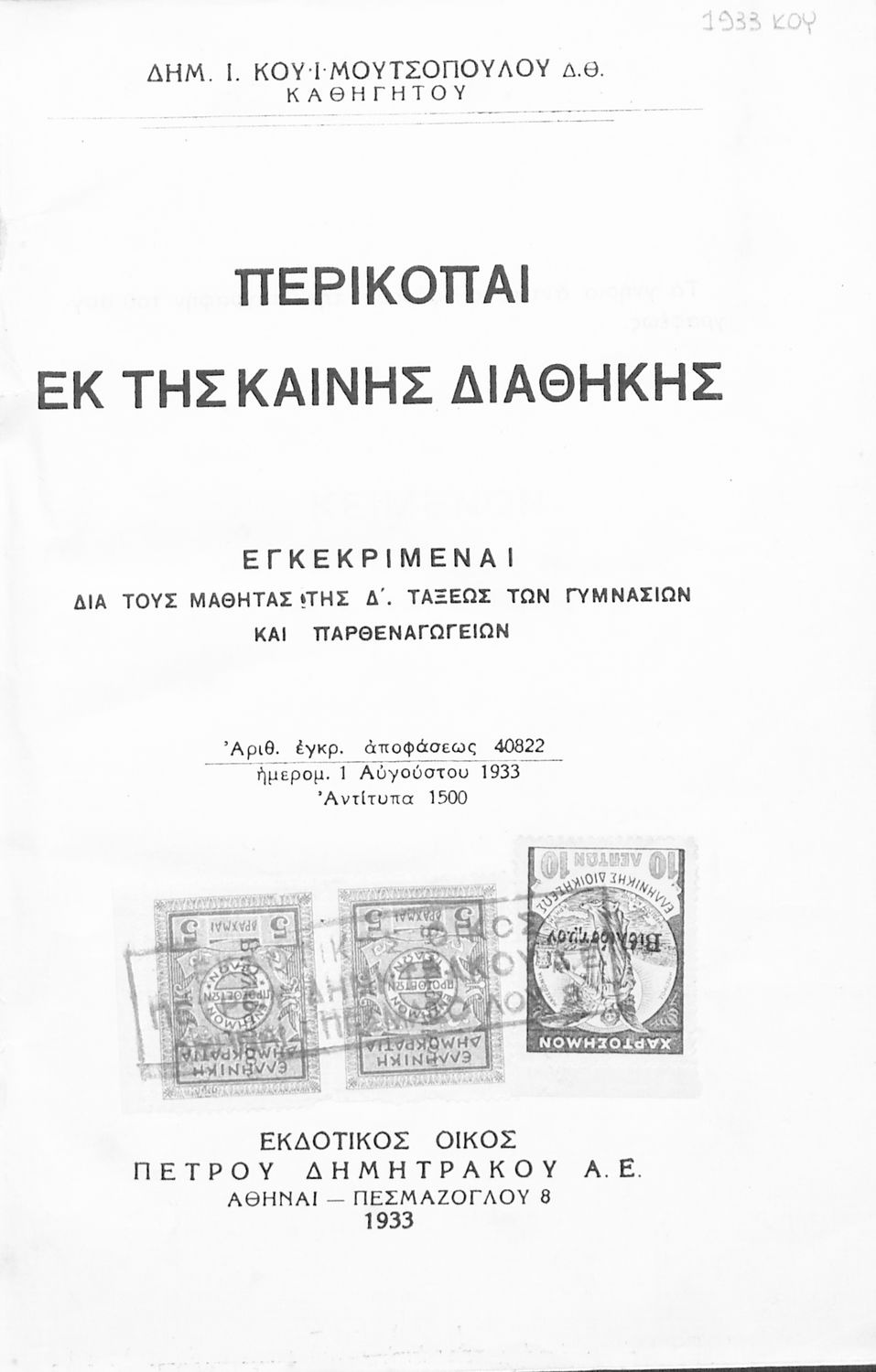 Εκδότης: Πέτρος Δημητράκος Α.Ε. Έτος έκδοσης: 1933 Τόπος έκδοσης: Αθήνα Έκδοση: 1η Υπουργική απόφαση / Σύμβαση: 40822/1-8-1933 |