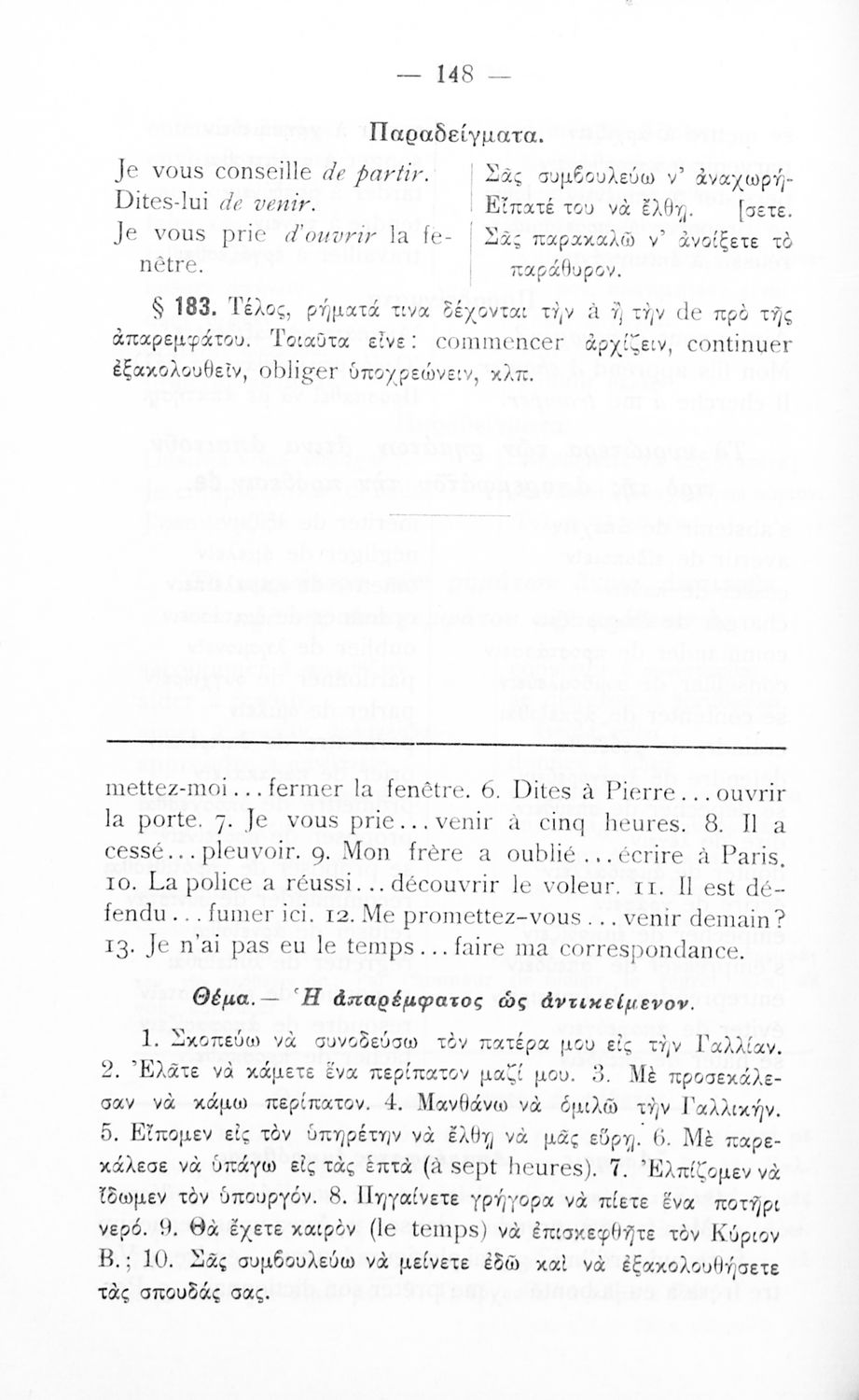 Κωδικός αναγνώρισης: 02-01443 Τίτλος: Γραμματική της γαλλικής γλώσσης προς χρήσιν πασών των τάξεων των Εξαταξίων Γυμνασίων και των αντιστοίχων τάξεων των λοιπών Σχολείων της Μ. Εκπαιδεύσεως Συγγραφέας: Θεόδωρος Γ. Κύπριος Μέγεθος και υπόστρωμα: Μαθητικό βοήθημα, μαλακό εξώφυλλο, 204 σελίδες. |