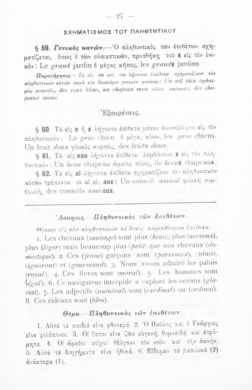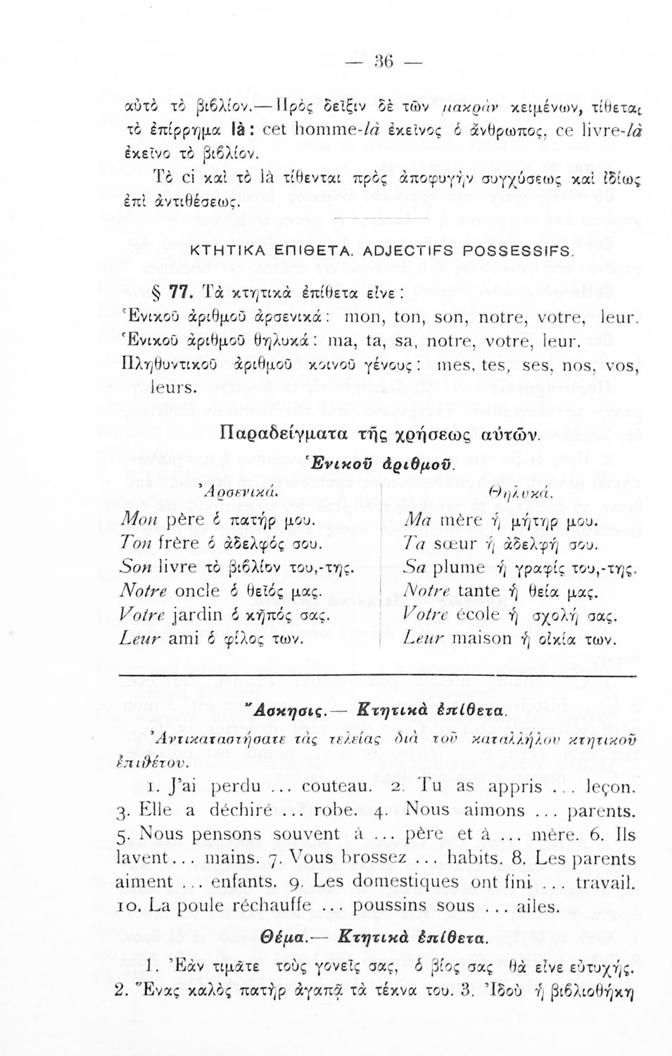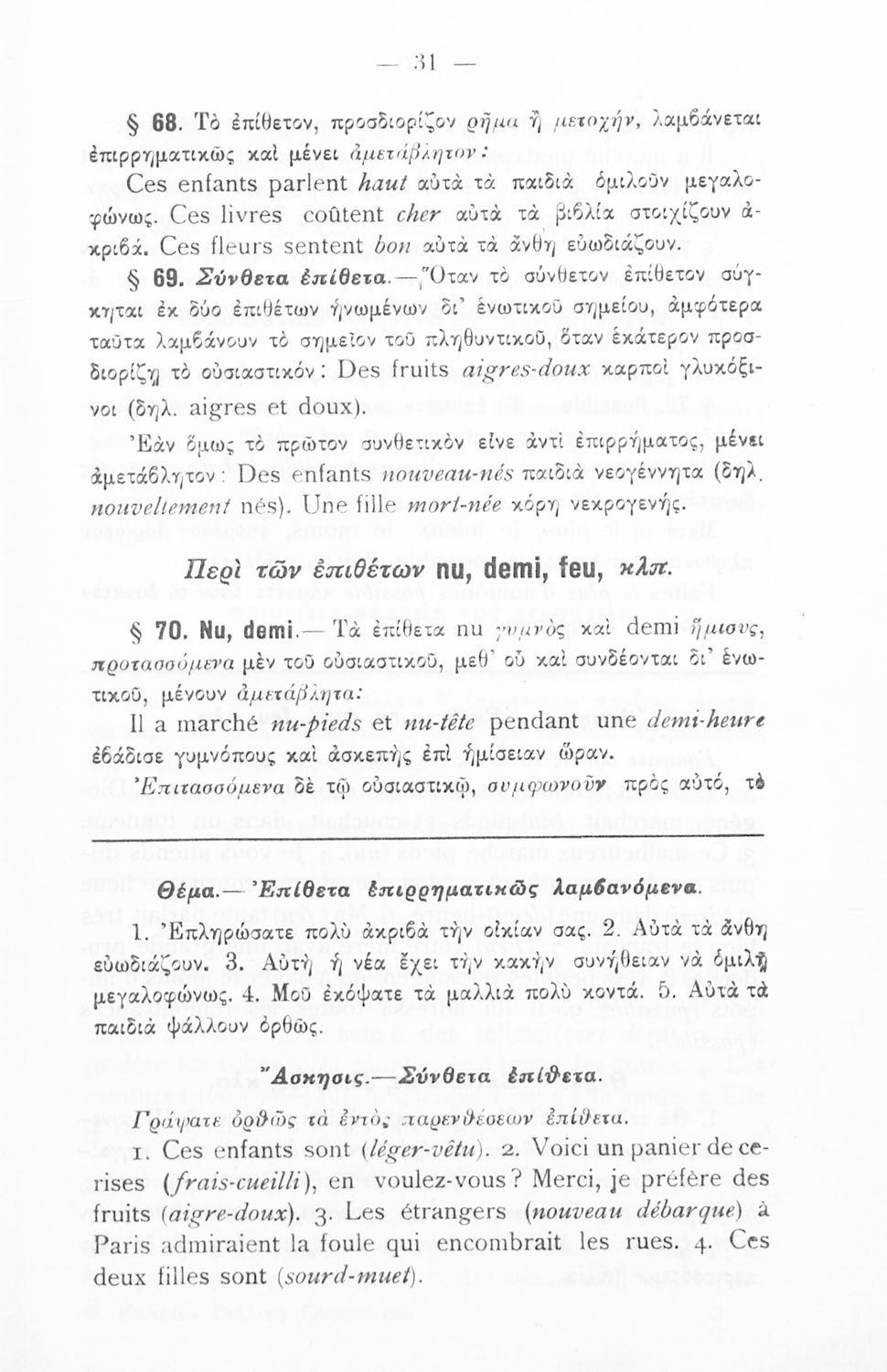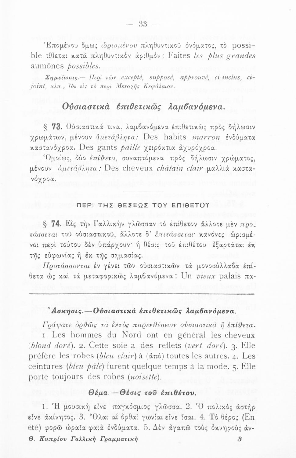 Γραμματική της Γαλλικής γλώσσας για τα Τετρατάξια Γυμνάσια, τη Γ΄ τάξη των Αστικών Σχολείων των Θηλέων και τα Διδασκαλεία της Δημοτικής Εκπαίδευσης που περιλαμβάνει θεωρία, ασκήσεις και λεξιλόγιο.