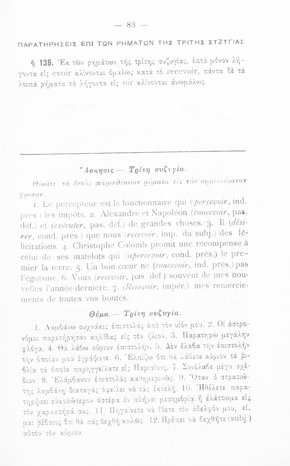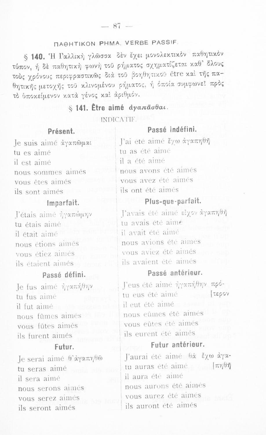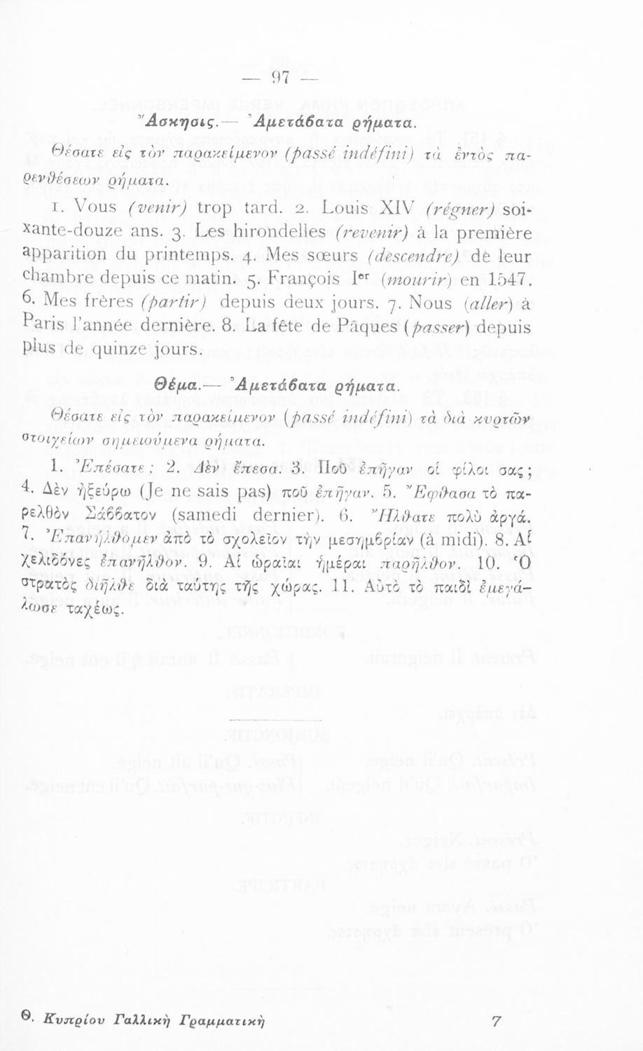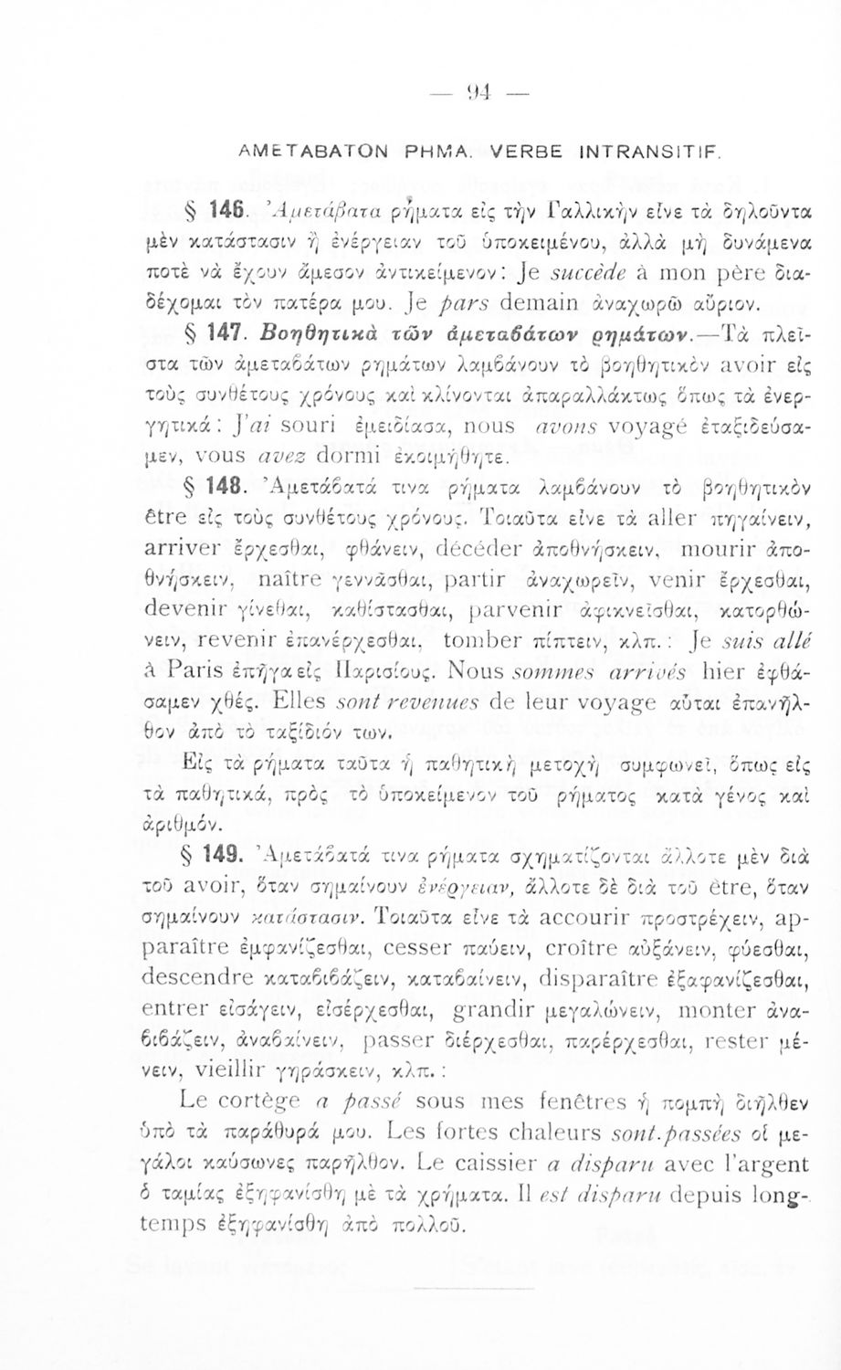Γραμματική της Γαλλικής γλώσσας για τα Τετρατάξια Γυμνάσια, τη Γ΄ τάξη των Αστικών Σχολείων των Θηλέων και τα Διδασκαλεία της Δημοτικής Εκπαίδευσης που περιλαμβάνει θεωρία, ασκήσεις και λεξιλόγιο.