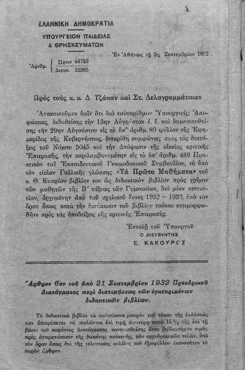 Κωδικός αναγνώρισης: 02-01444 Τίτλος: Τα πρώτα μαθήματα, Γαλλικόν βιβλίον της Β΄ τάξεως κατά το νέον αναλυτικόν πρόγραμμα δια την Β΄ τάξιν των Εξαταξίων Γυμνασίων, την Β΄ τάξιν των Ημιγυμνασίων και τας αντιστοίχους τάξεις των λοιπών Σχολείων της Μέσης Εκπαιδεύσεως Συγγραφέας: Θεόδωρος Γ. Κύπριος Μέγεθος και υπόστρωμα: Σχολικό εγχειρίδιο, μαλακό εξώφυλλο, 112 σελίδες. Σκίτσα (ασπρόμαυρα). |