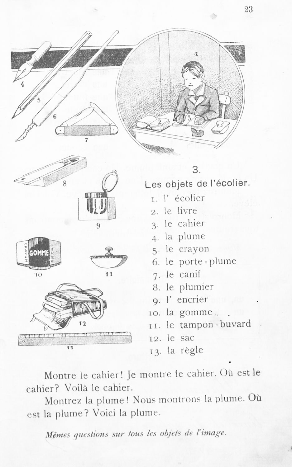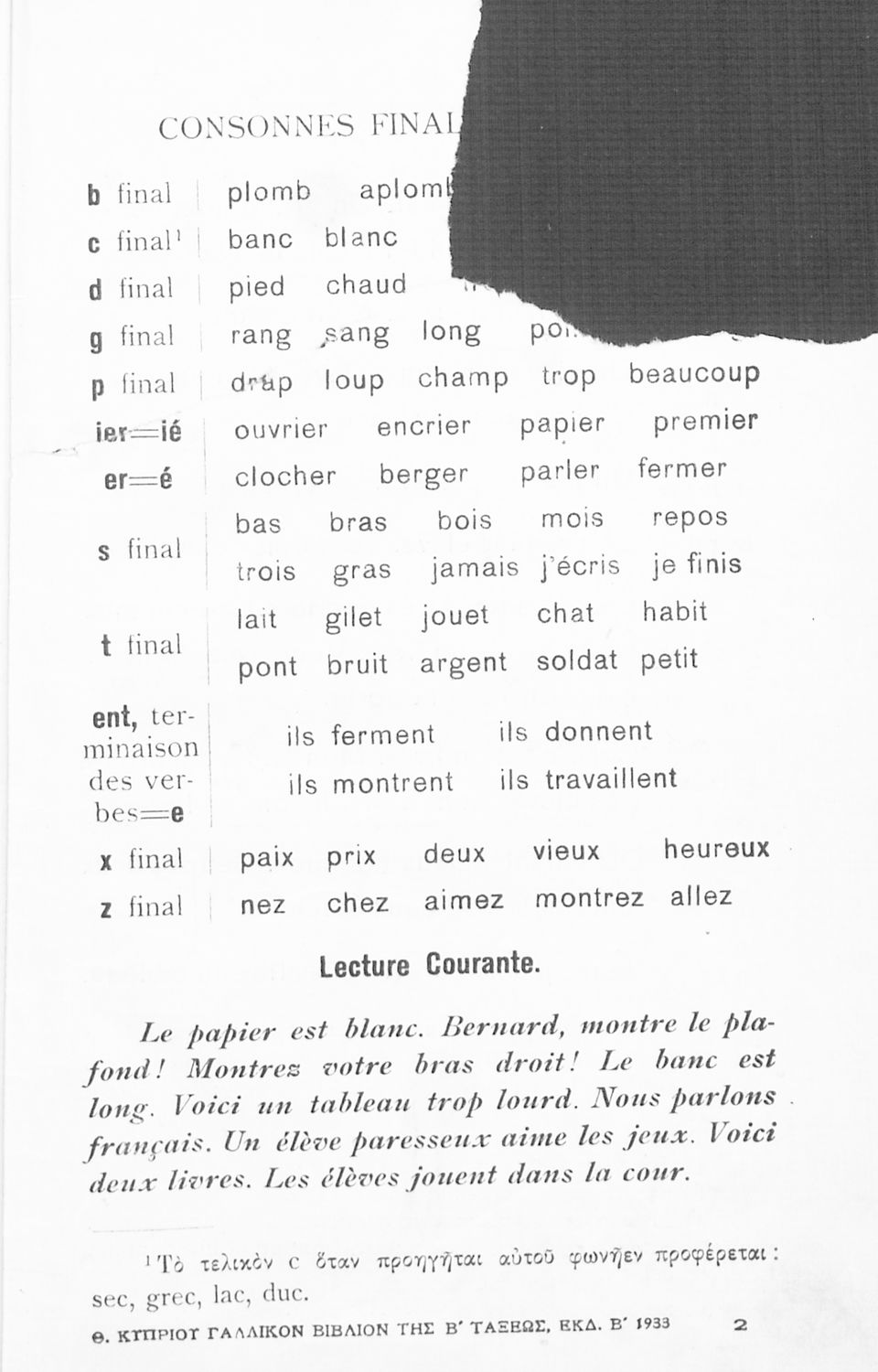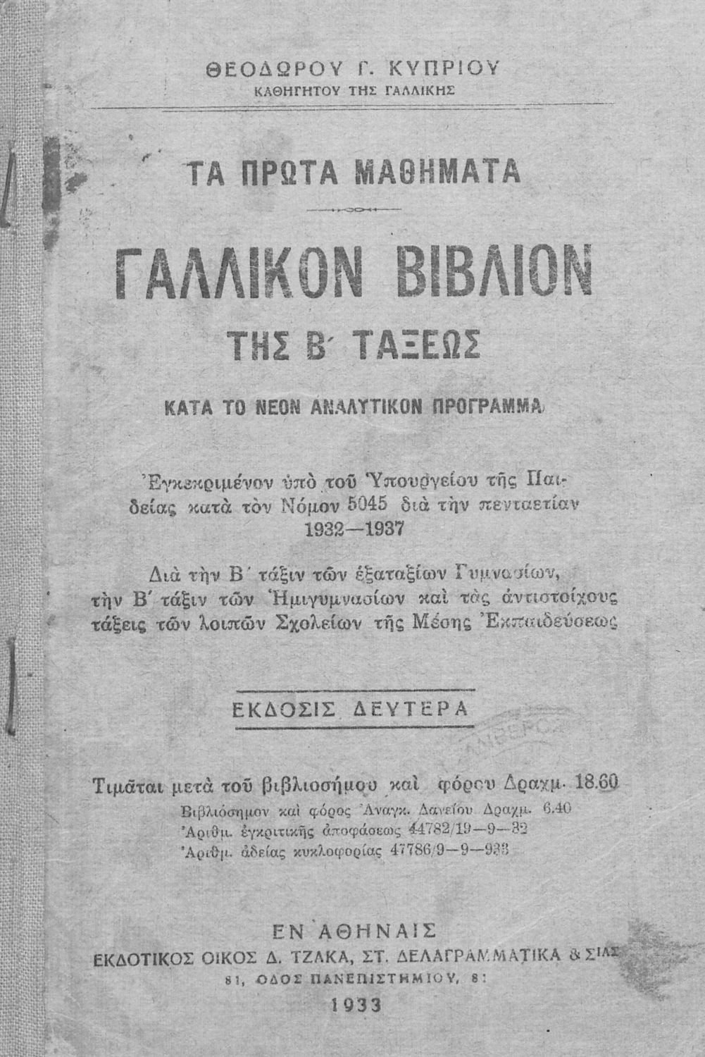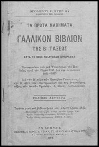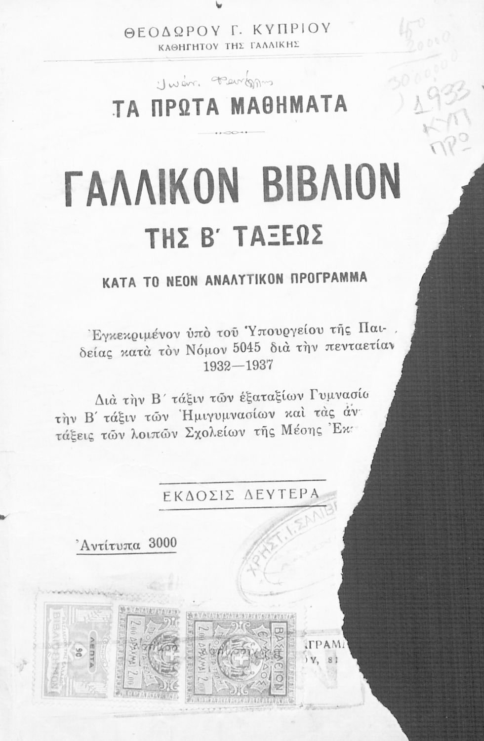Κωδικός αναγνώρισης: 02-01444 Τίτλος: Τα πρώτα μαθήματα, Γαλλικόν βιβλίον της Β΄ τάξεως κατά το νέον αναλυτικόν πρόγραμμα δια την Β΄ τάξιν των Εξαταξίων Γυμνασίων, την Β΄ τάξιν των Ημιγυμνασίων και τας αντιστοίχους τάξεις των λοιπών Σχολείων της Μέσης Εκπαιδεύσεως Συγγραφέας: Θεόδωρος Γ. Κύπριος Μέγεθος και υπόστρωμα: Σχολικό εγχειρίδιο, μαλακό εξώφυλλο, 112 σελίδες. Σκίτσα (ασπρόμαυρα). |