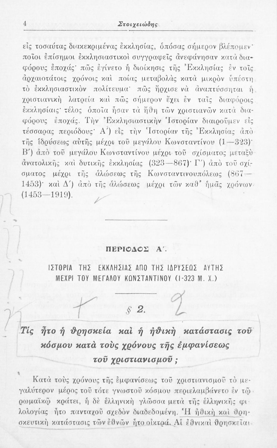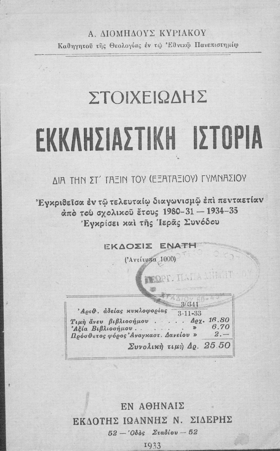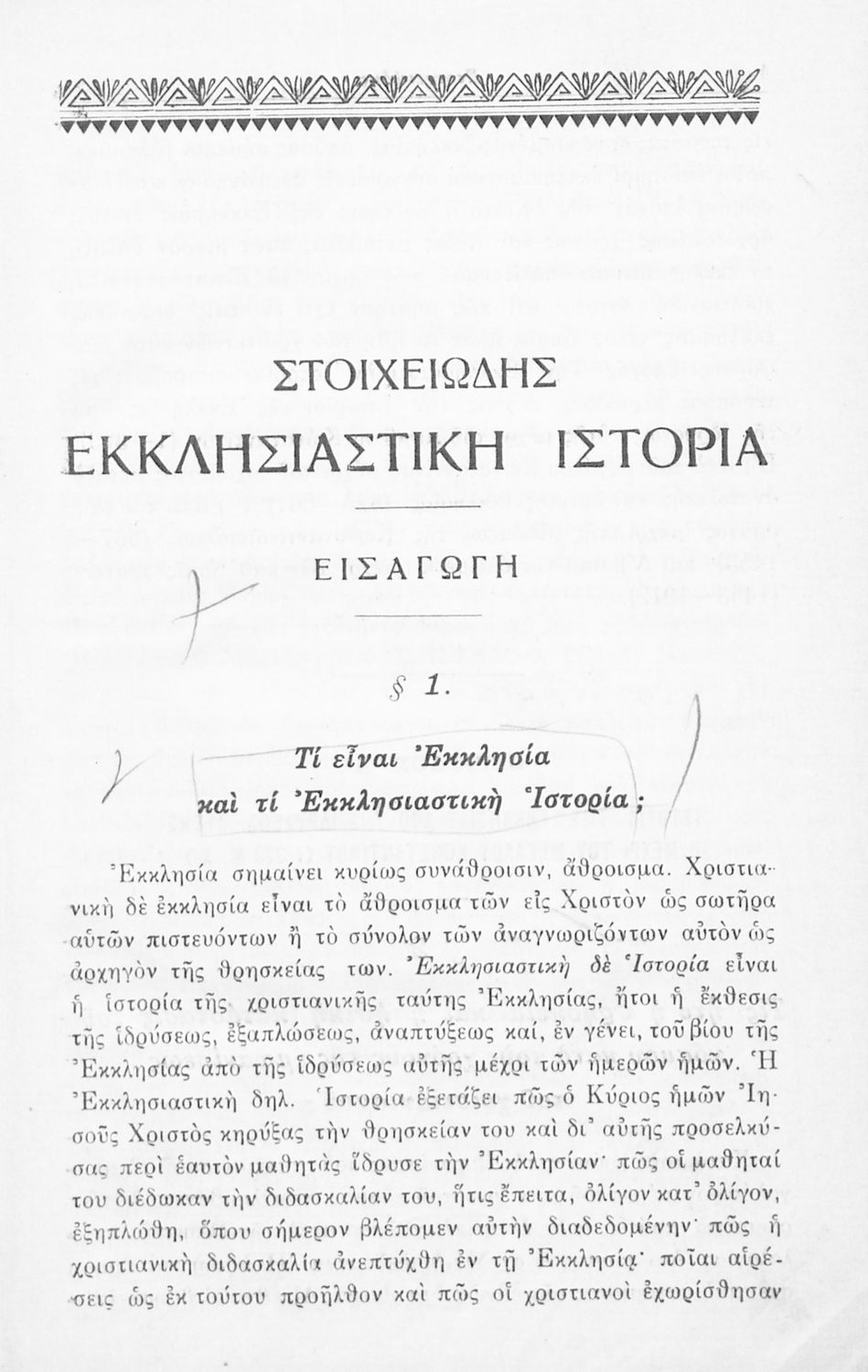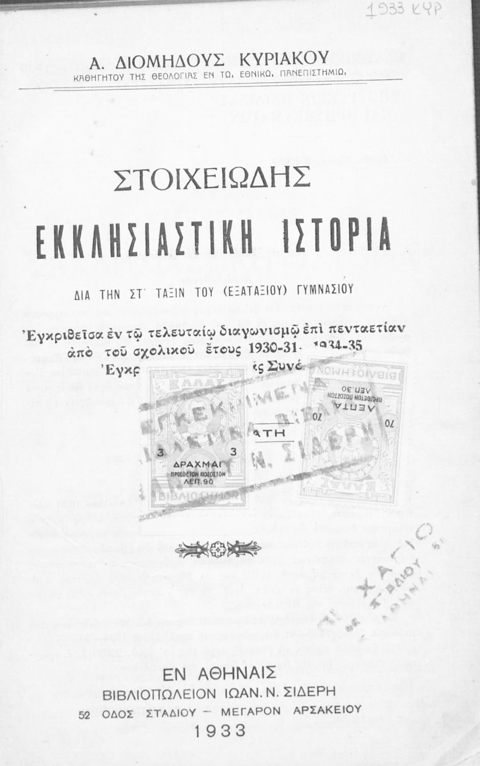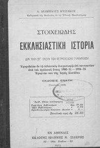 Βαθμίδα εκπαίδευσης: Δευτεροβάθμια Τάξη: ΣΤ' Γυμνασίου Μάθημα: Θρησκευτικά Γλώσσα: Καθαρεύουσα Παρουσίαση περιεχομένου: Σχολικό εγχειρίδιο Θρησκευτικών ΣΤ΄ Γυμνασίου δομημένο ιστορικά με βάση το σχίσμα των εκκλησιών σε ανατολική και δυτική και την άλωση της Κωνσταντινούπολης. Το εγχειρίδιο εγκρίθηκε από την Ιερά Σύνοδο. Ο συγγραφέας ήταν καθηγητής Θεολογίας στο Εθνικό Πανεπιστήμιο. |