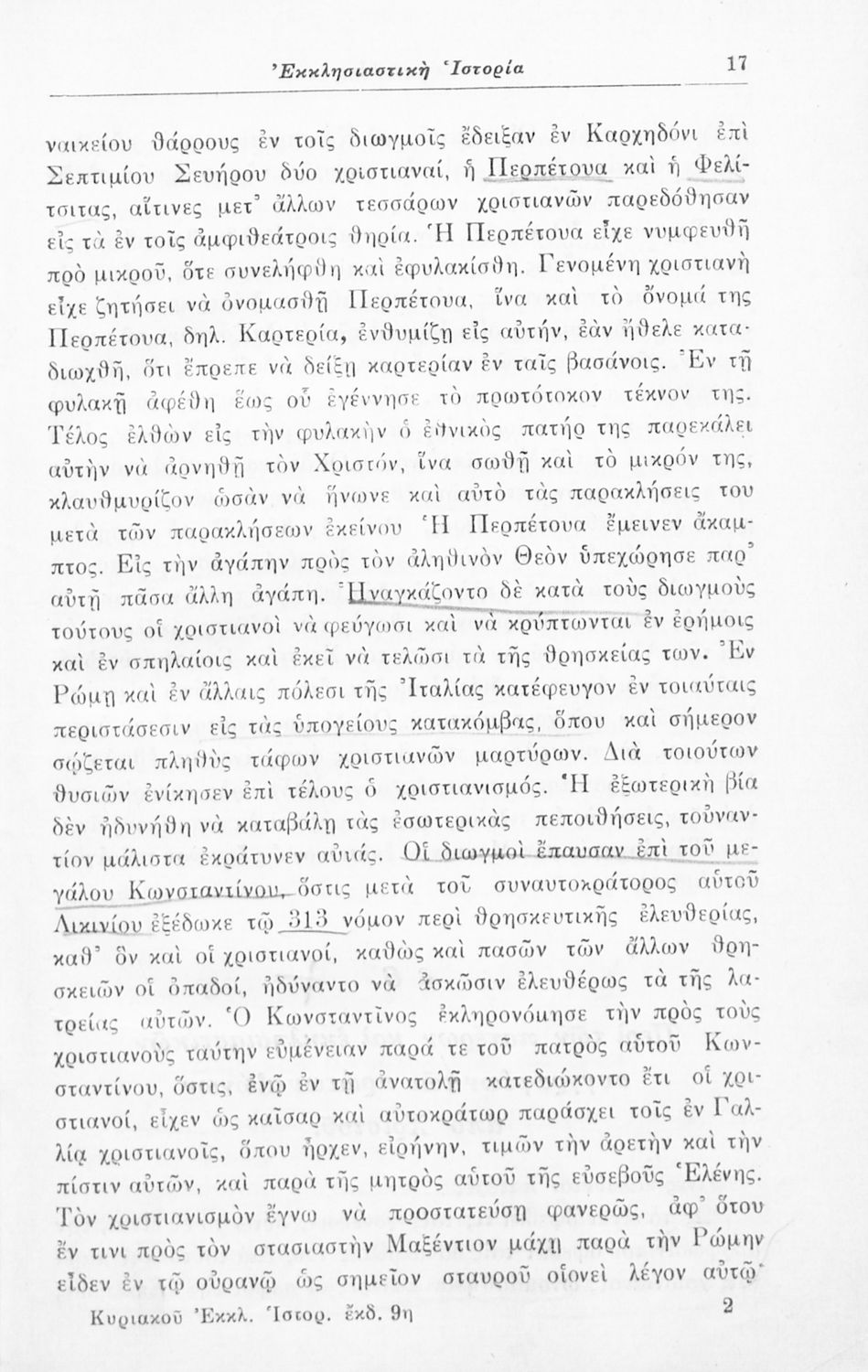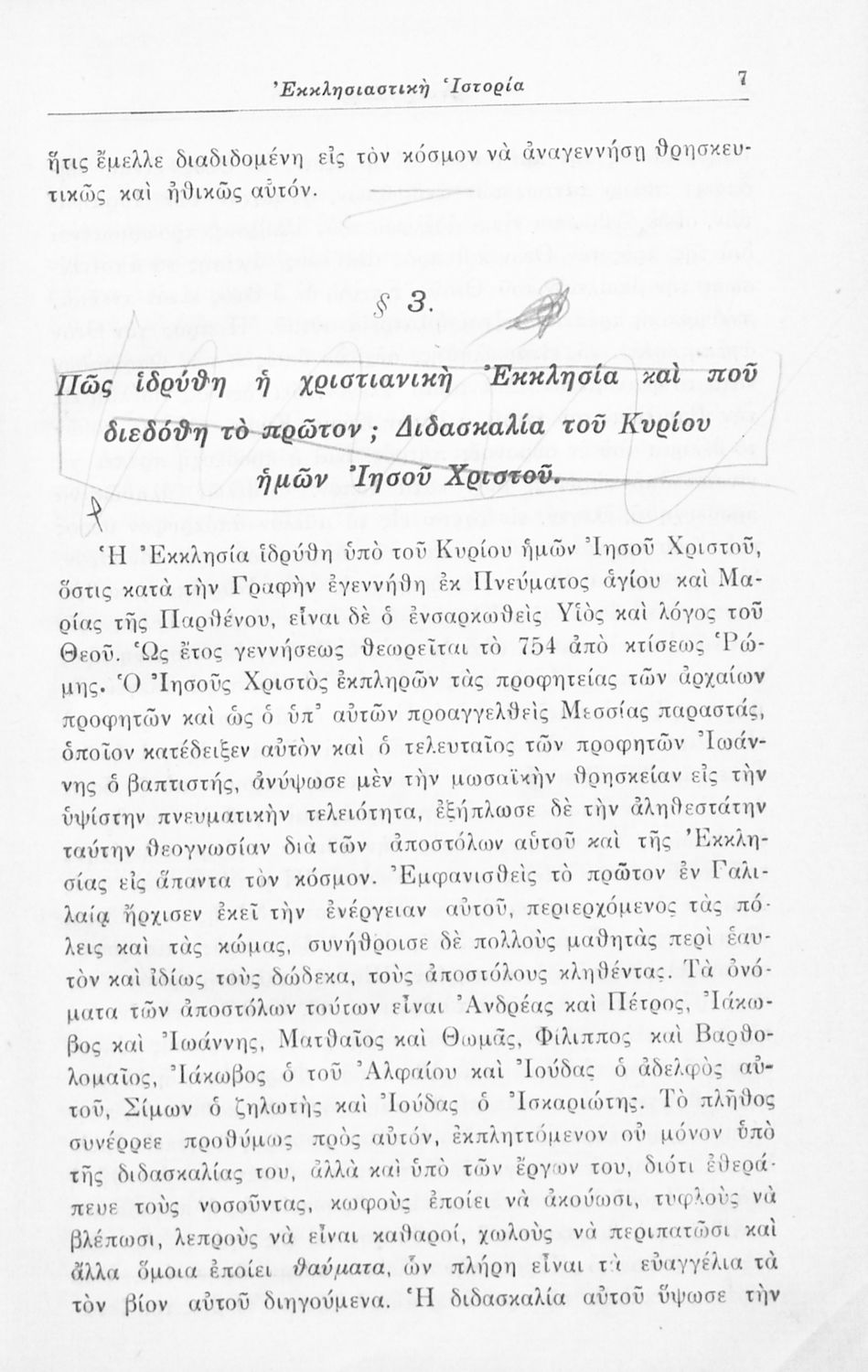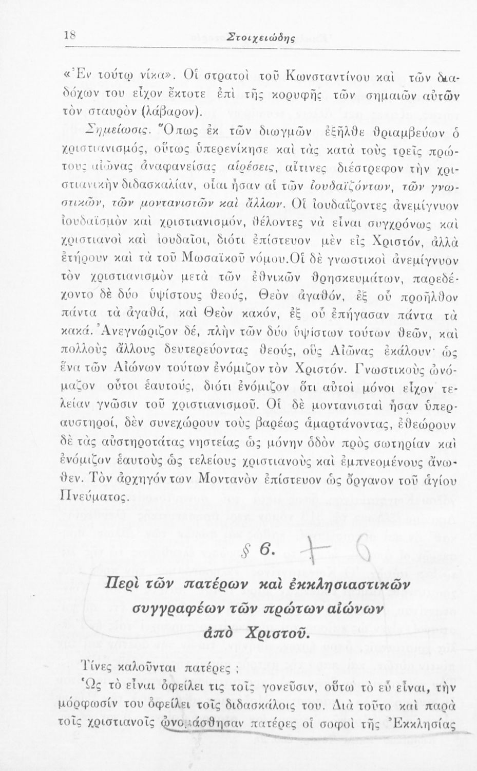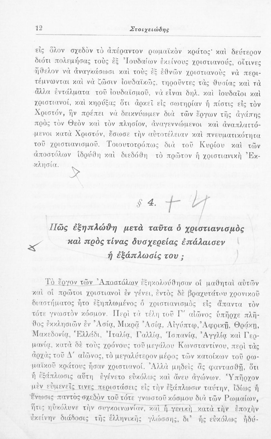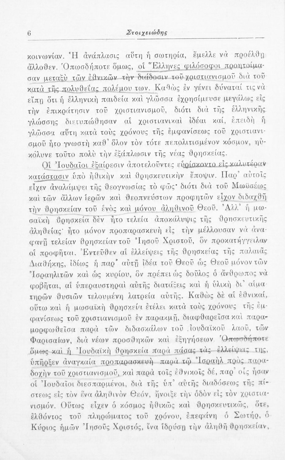 Βαθμίδα εκπαίδευσης: Δευτεροβάθμια Τάξη: ΣΤ' Γυμνασίου Μάθημα: Θρησκευτικά Γλώσσα: Καθαρεύουσα Παρουσίαση περιεχομένου: Σχολικό εγχειρίδιο Θρησκευτικών ΣΤ΄ Γυμνασίου δομημένο ιστορικά με βάση το σχίσμα των εκκλησιών σε ανατολική και δυτική και την άλωση της Κωνσταντινούπολης. Το εγχειρίδιο εγκρίθηκε από την Ιερά Σύνοδο. Ο συγγραφέας ήταν καθηγητής Θεολογίας στο Εθνικό Πανεπιστήμιο. |