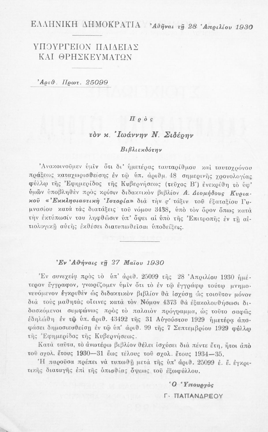 Εκδότης: Ιωάννης Ν. Σιδέρης Έτος έκδοσης: 1933 Τόπος έκδοσης: Αθήνα Έκδοση: 9η Υπουργική απόφαση / Σύμβαση: 25099/28-4-1930 |
