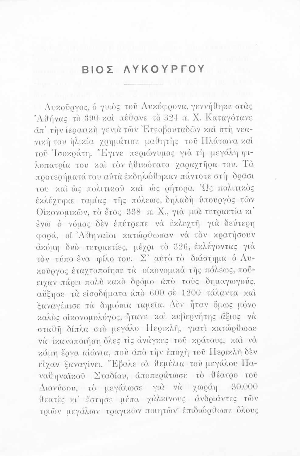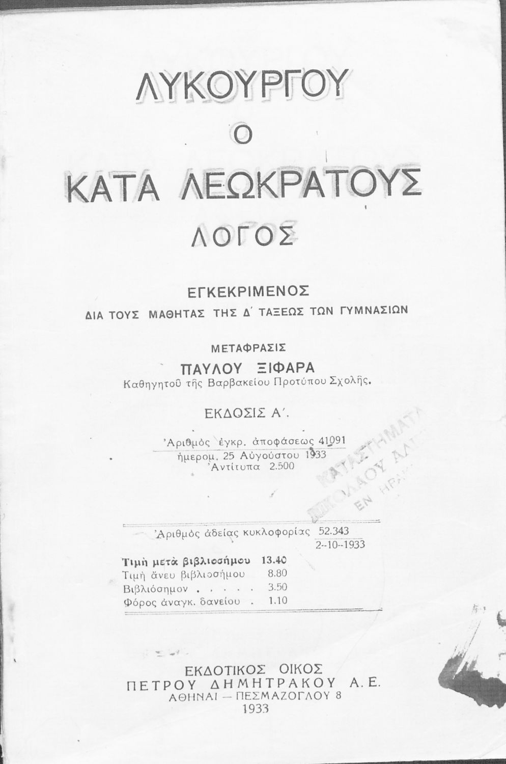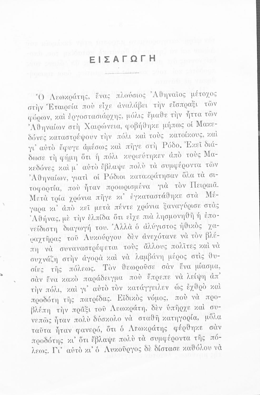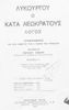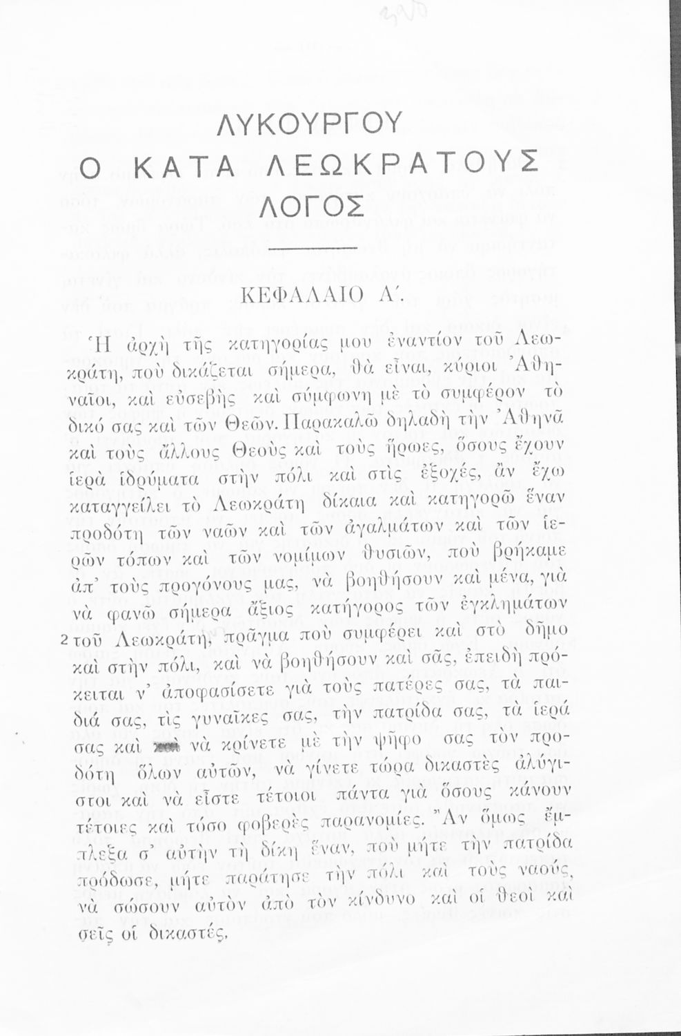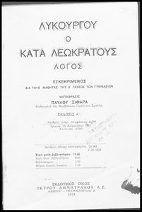 Σχολικό εγχειρίδιο Αρχαίων Ελληνικών Δ΄ Γυμνασίου που περιλαμβάνει εισαγωγή στη ζωή και το έργο του Λυκούργου, τον Λόγο κατά Λεωκράτους και ερμηνευτικά και πραγματολογικά σχόλια.