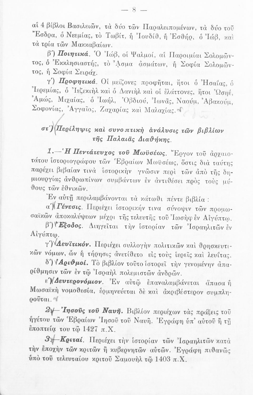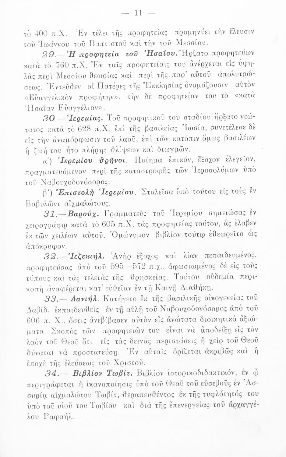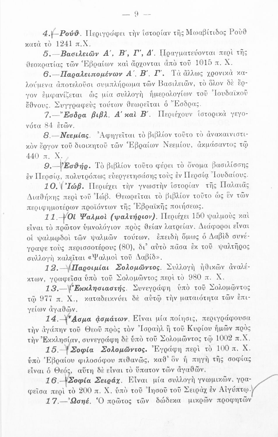 Βαθμίδα εκπαίδευσης: Δευτεροβάθμια Τάξη: Δ' Γυμνασίου Μάθημα: Θρησκευτικά Γλώσσα: Καθαρεύουσα Παρουσίαση περιεχομένου: Σχολικό εγχειρίδιο Θρησκευτικών Δ' Γυμνασίου που περιέχει ιστορικές, ποιητικές, προφητικές και χριστολογικές περικοπές από την Παλαιά Διαθήκη και ερμηνευτικές σημειώσεις. Περιέχει και σύντομη ιστορία του Ισραηλίτικου λαού. |