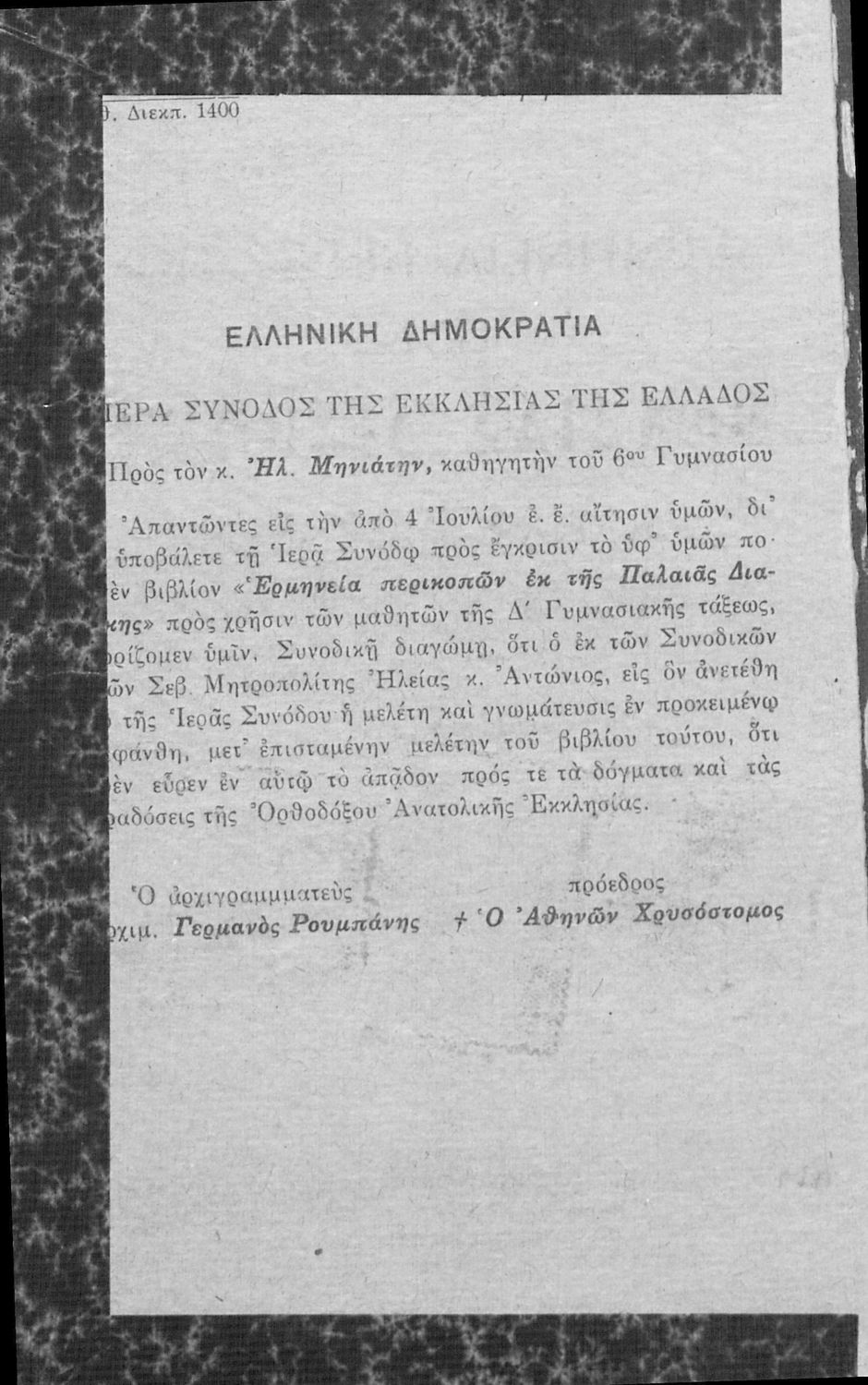 Κωδικός αναγνώρισης: 02-01449 Τίτλος: Ερμηνεία περικοπών εκ της Παλαιάς Διαθήκης δια την Δ΄ τάξιν του Γυμνασίου Συγγραφέας: Ηλίας Μηνιάτης Μέγεθος και υπόστρωμα: Σχολικό εγχειρίδιο, σκληρό εξώφυλλο, 126 σελίδες. Εικόνες (ασπρόμαυρες), σκίτσα (ασπρόμαυρα), χάρτες (ασπρόμαυροι). |