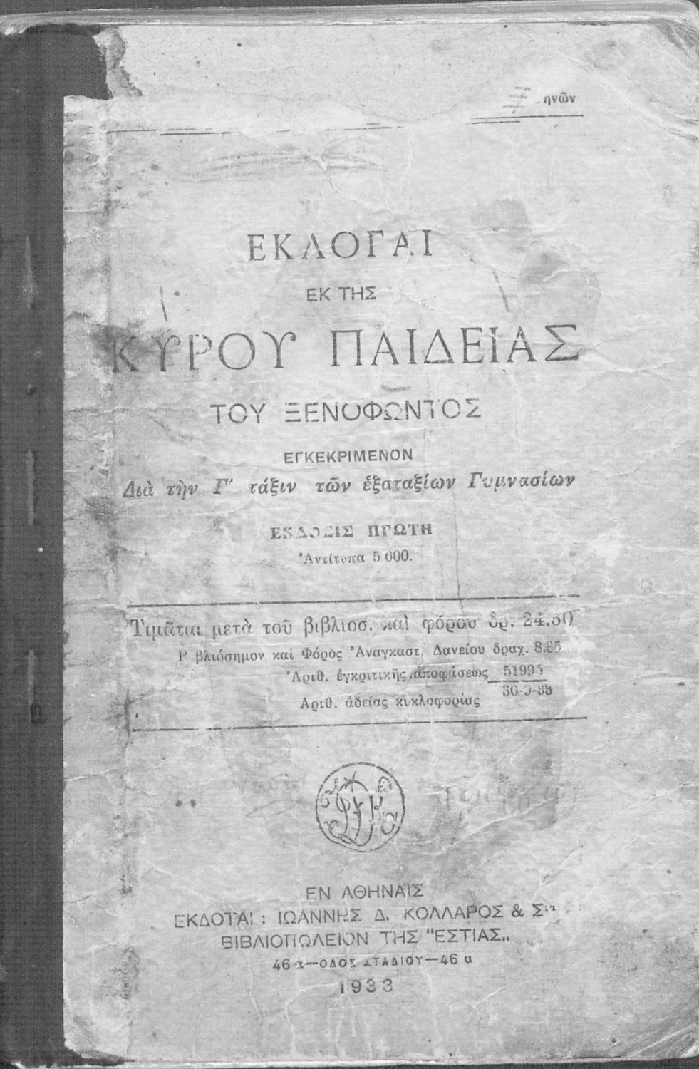 Κωδικός αναγνώρισης: 02-01453 Τίτλος: Εκλογαί εκ της Κύρου Παιδείας του Ξενοφώντος: εγκεκριμένον διά την Γ΄ τάξιν των Εξαταξίων Γυμνασίων Συγγραφέας: Ξενοφών, Δ. Τσιρίμπας (σχόλια) Μέγεθος και υπόστρωμα: Σχολικό εγχειρίδιο, σκληρό εξώφυλλο, 135 σελίδες. Εικόνες (ασπρόμαυρες), σκίτσα (ασπρόμαυρα), χάρτες (ασπρόμαυροι). |