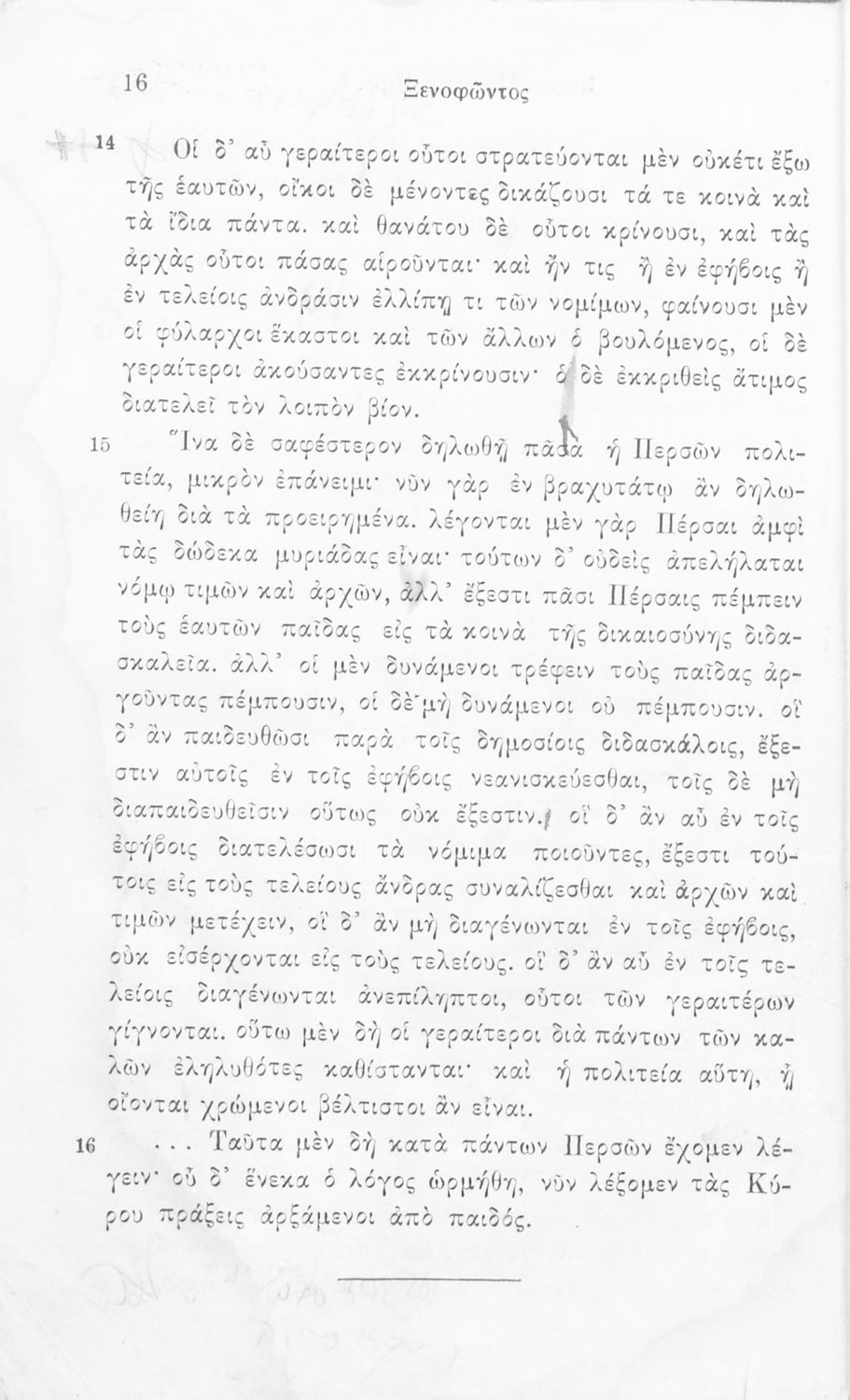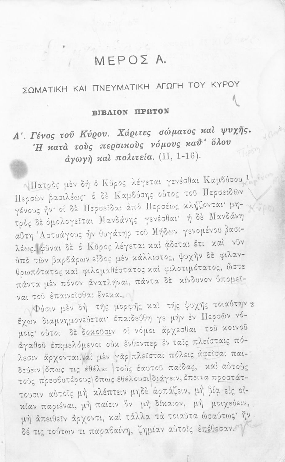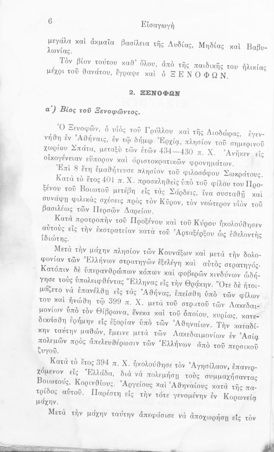 Βαθμίδα εκπαίδευσης: Δευτεροβάθμια Τάξη: Γ' Γυμνασίου Μάθημα: Αρχαία Ελληνικά Γλώσσα: Καθαρεύουσα Παρουσίαση περιεχομένου: Σχολικό εγχειρίδιο Αρχαίων Ελληνικών Γ΄ Γυμνασίου που περιλαμβάνει αποσπάσματα από το έργο του Ξενοφώντα Κύρου Ανάβασις, εισαγωγικά σχόλια για τη ζωή και το έργο του, ερμηνευτικές και γραμματικές παρατηρήσεις. |