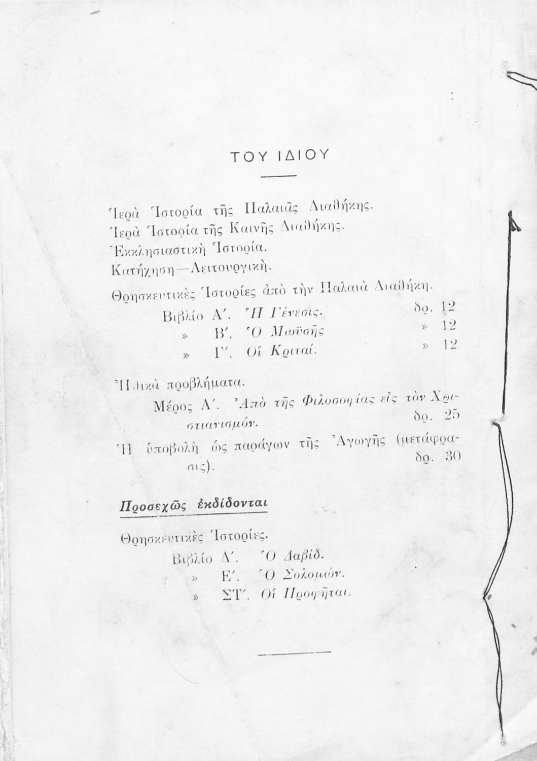 Σχολικά εγχειρίδια Θρησκευτικών για τα Ελληνικά Σχολεία και τα Παρθεναγωγεία που περιλαμβάνει την ιστορία της Καινής Διαθήκης από τον Ευαγγελισμό της Θεοτόκου μέχρι τη δράση των Αποστόλων.