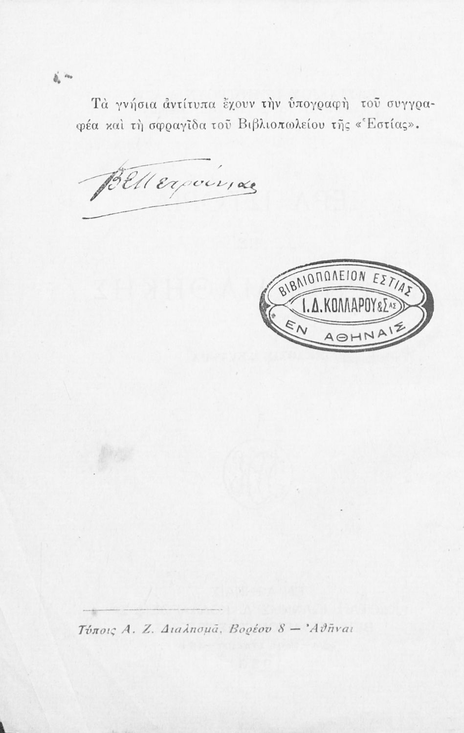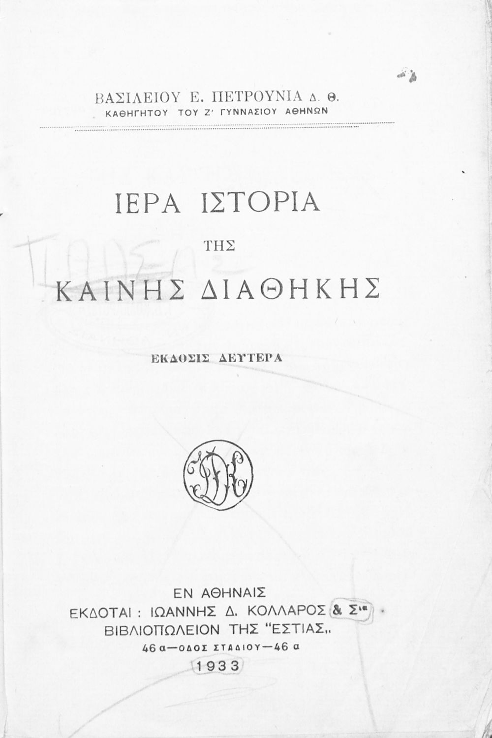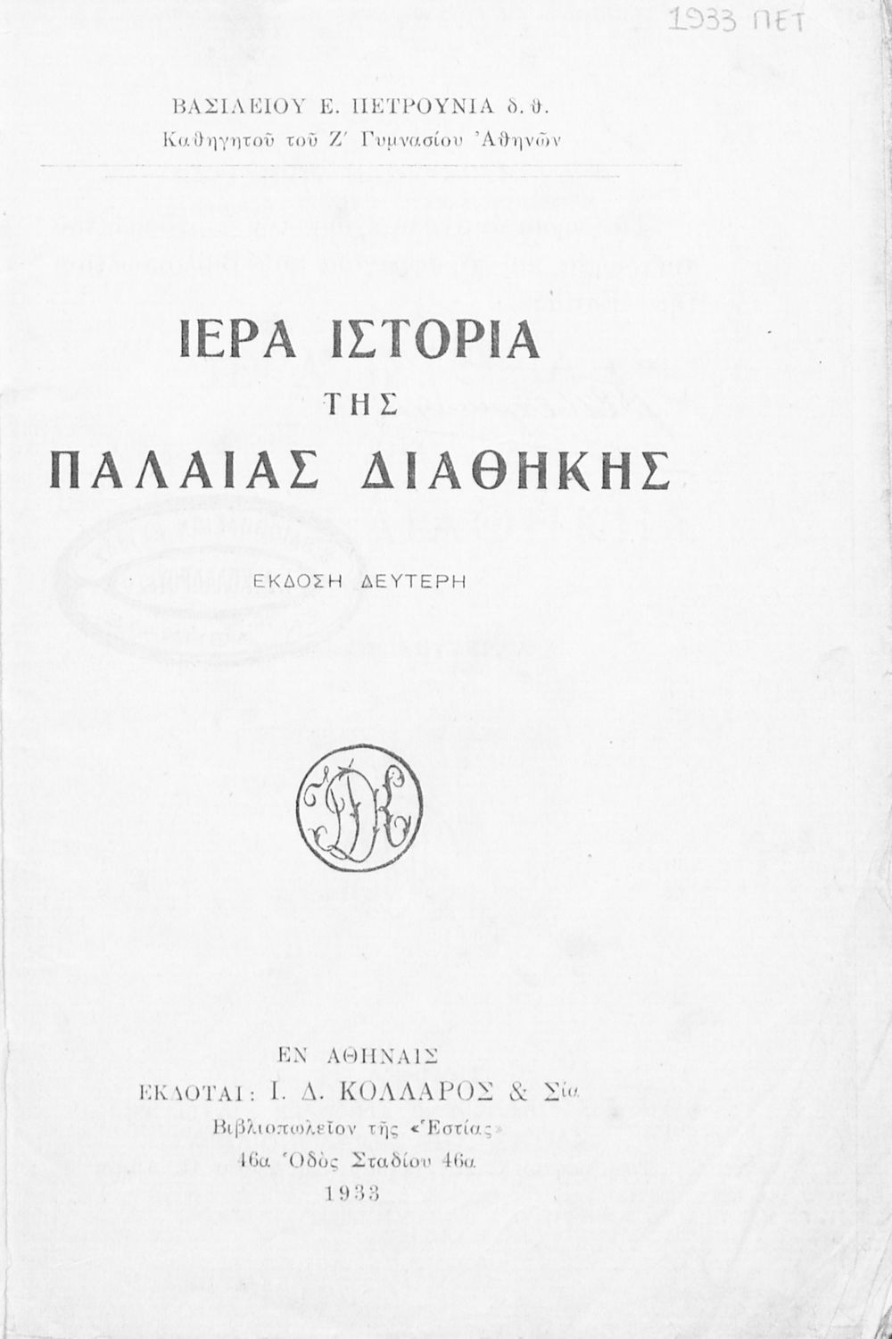 Εκδότης: Ιωάννης Δ. Κολλάρος και ΣΙΑ Έτος έκδοσης: 1933 Τόπος έκδοσης: Αθήνα Έκδοση: 2η |