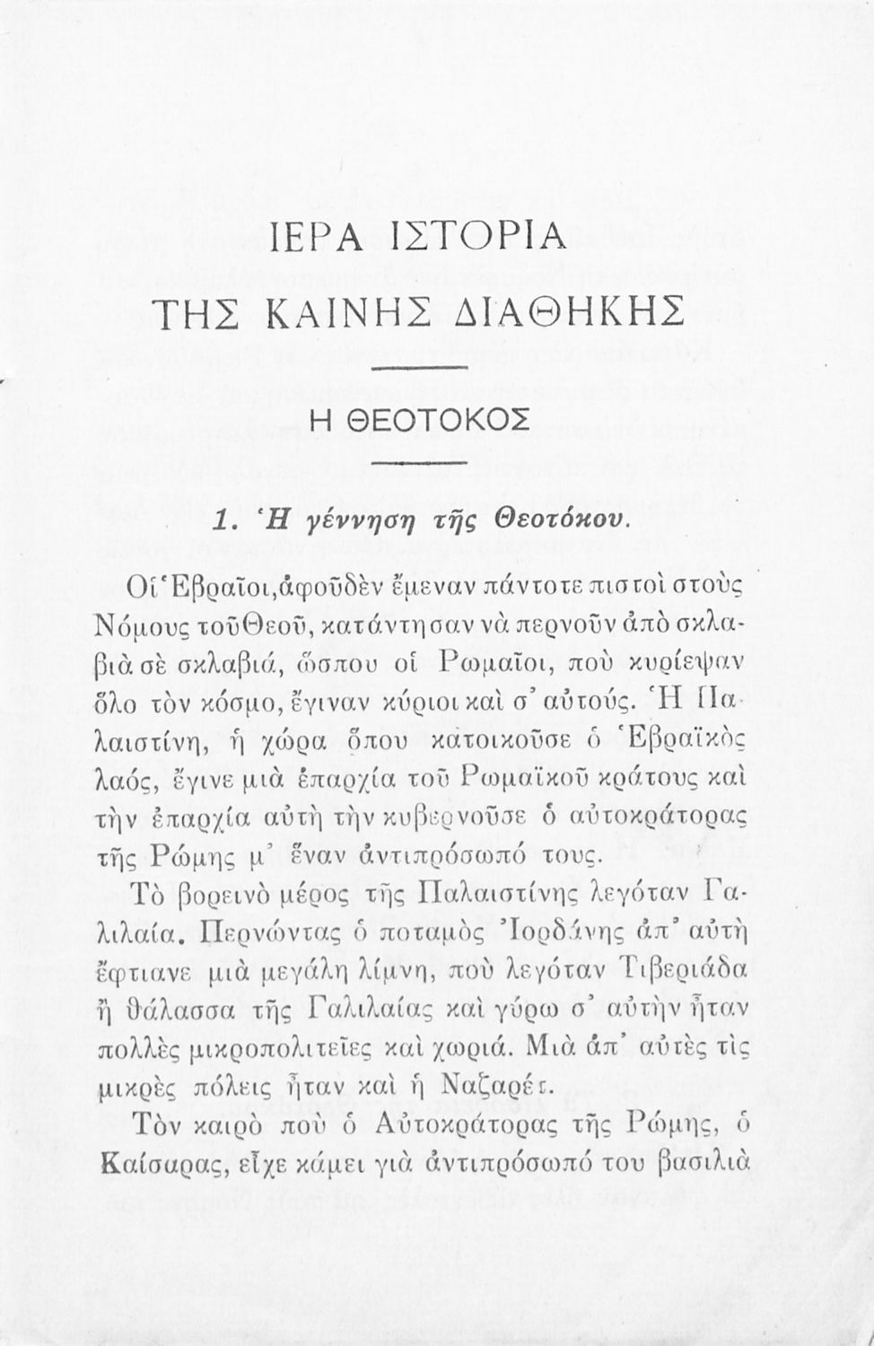 Σχολικό εγχειρίδιο Θρησκευτικών που αποτελεί μια εξιστόρηση της Καινής Διαθήκης από τη γέννηση της Θεοτόκου μέχρι την ανάληψη του Χριστού. Περιέχει χάρτη της Παλαιστίνης.