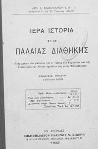 Κωδικός αναγνώρισης: 02-01463 Τίτλος: Ιερά ιστορία της Παλαιάς Διαθήκης προς χρήσιν των μαθητών της Α΄ τάξεως του Γυμνασίου και της αντιστοίχου των λοιπών σχολείων της Μέσης Εκπαιδεύσεως Συγγραφέας: Αργύρης Δ. Σακελλαρίου Μέγεθος και υπόστρωμα: Σχολικό εγχειρίδιο, σκληρό εξώφυλλο, 148 σελίδες. Εικόνες (ασπρόμαυρες), σκίτσα (ασπρόμαυρα), χάρτες (ασπρόμαυροι). |