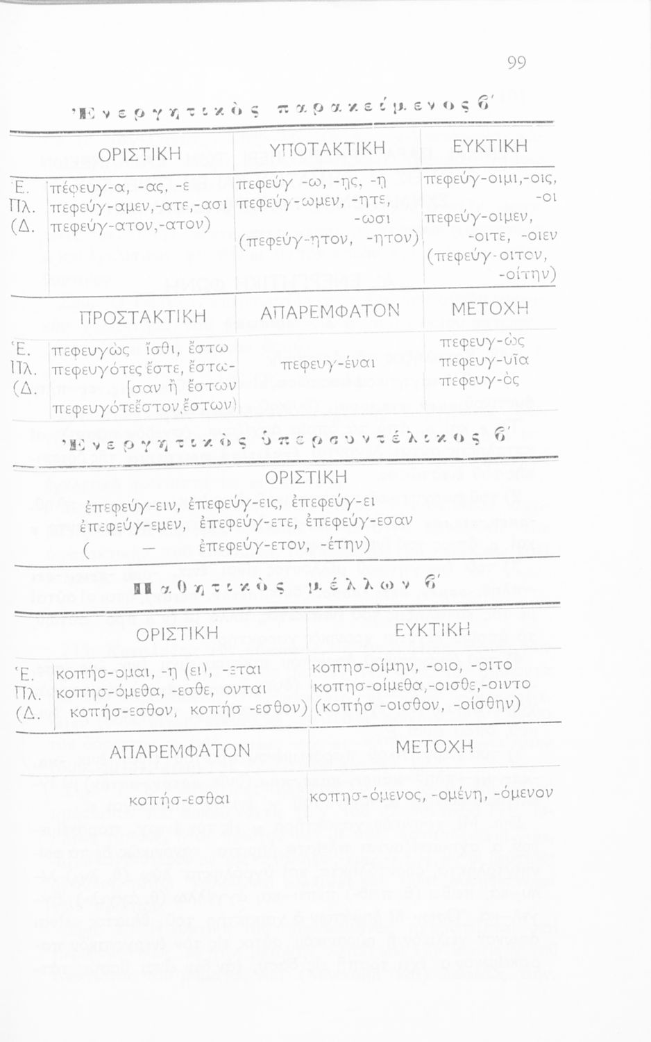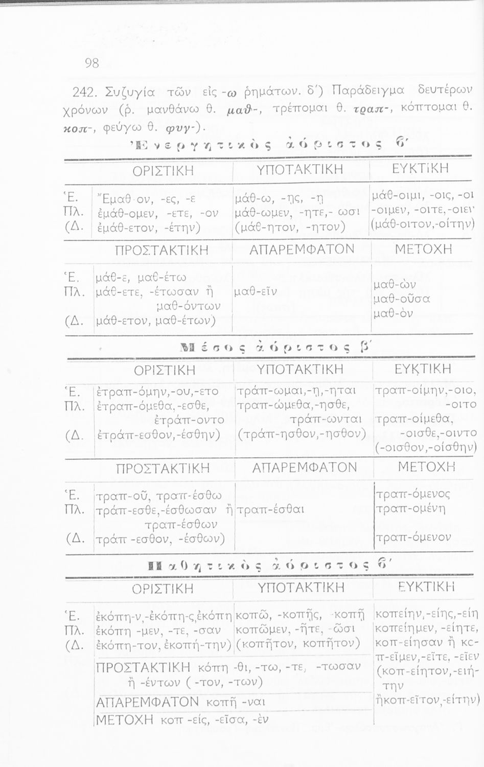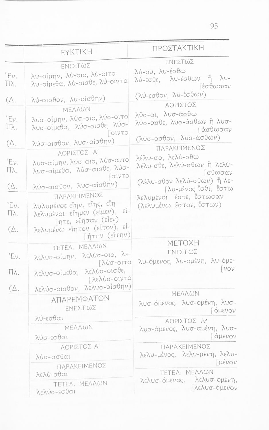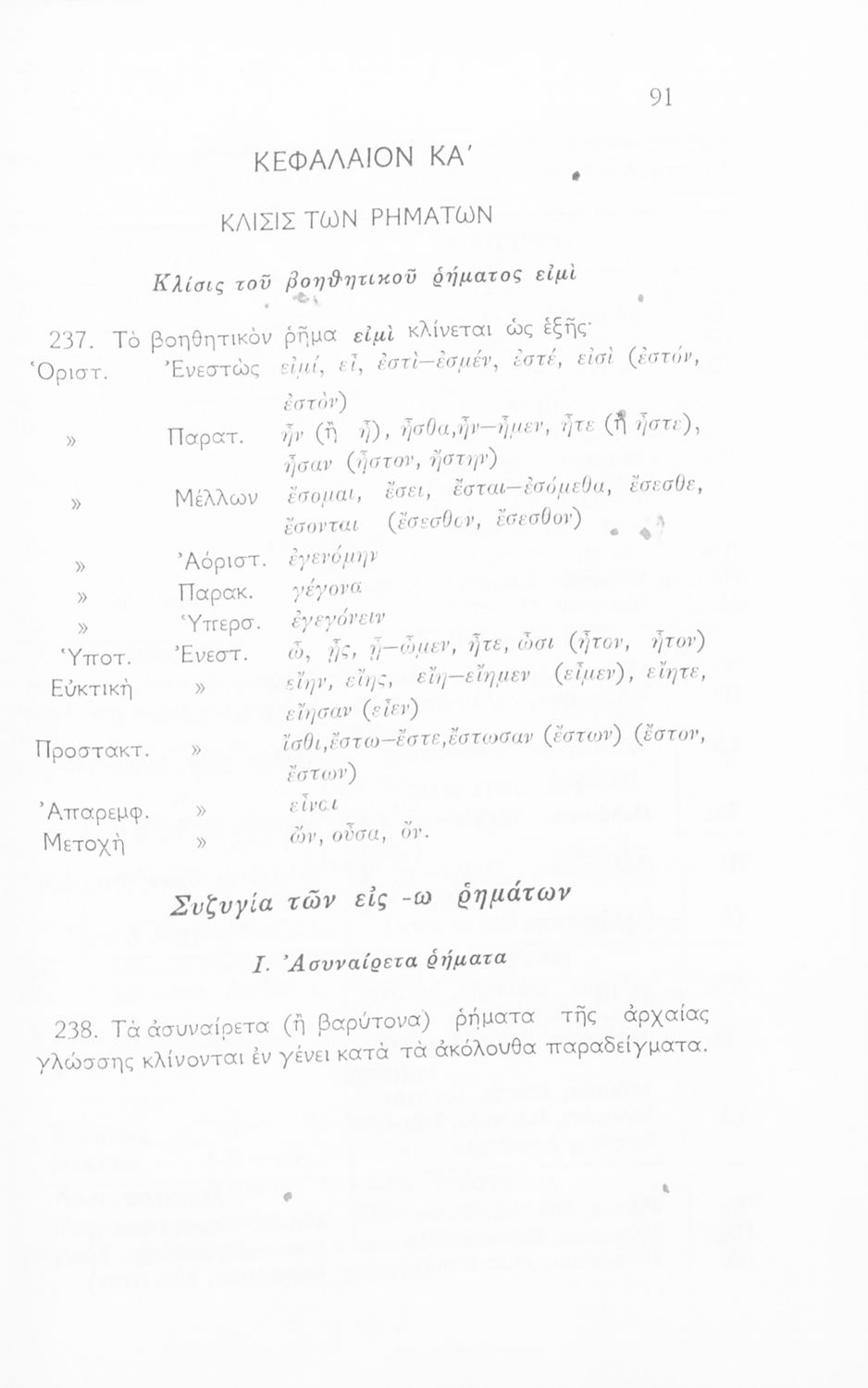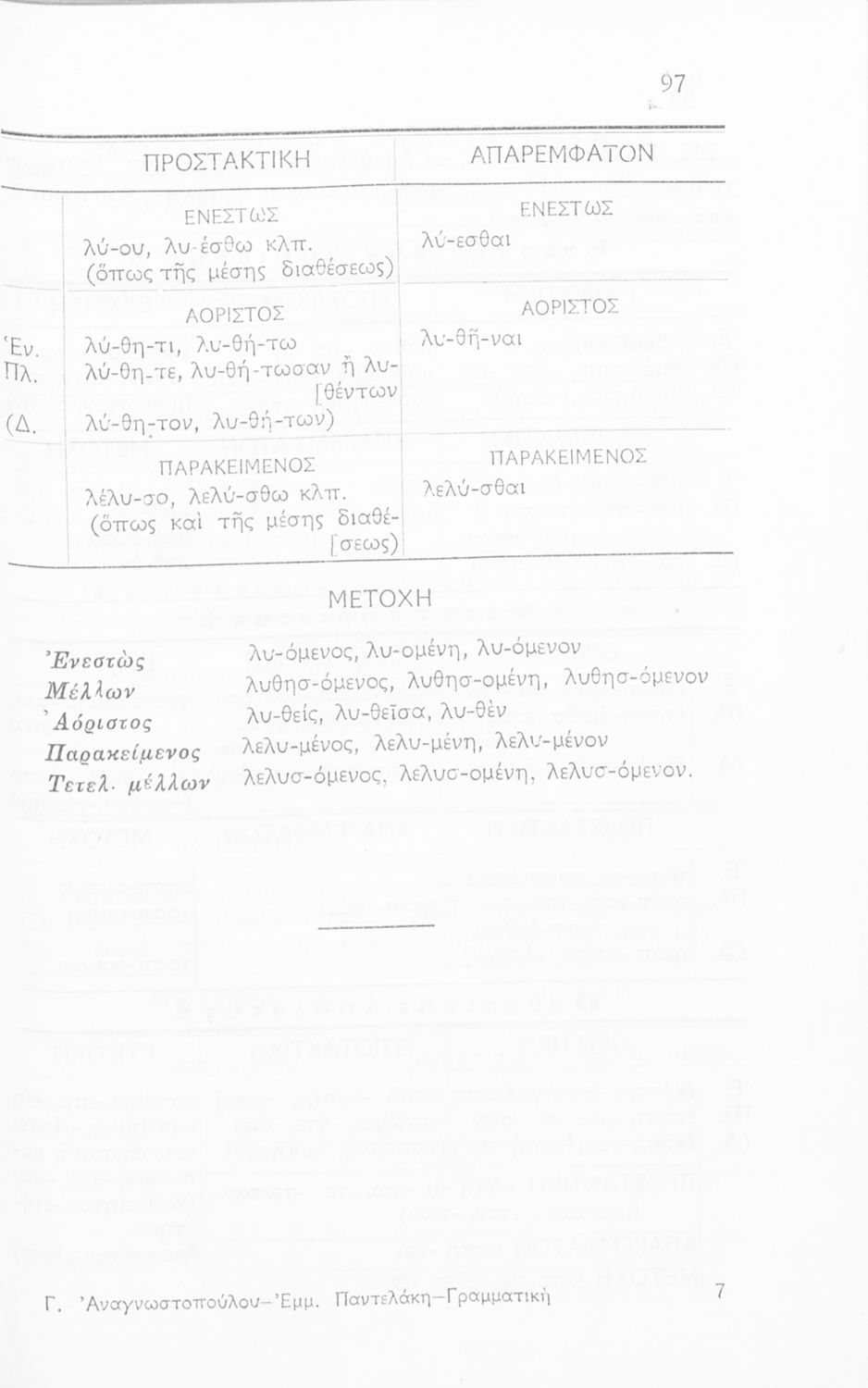 Σχολικό εγχειρίδιο Αρχαίων Ελληνικών Γυμνασίου που περιλαμβάνει τη γραμματική της αρχαίας ελληνικής και είναι χωρισμένο σε φθογγολογικό και τυπολογικό μέρος Περιέχει και κατάλογο ανωμάλων ρημάτων, ασκήσεις και