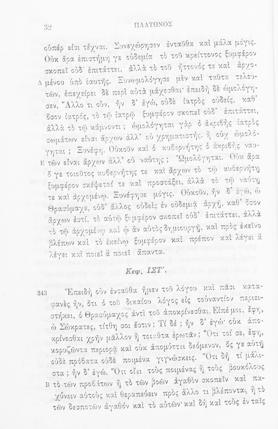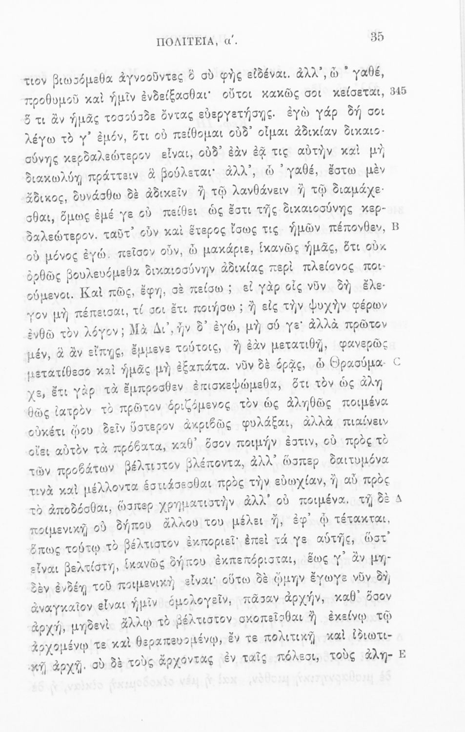 Σχολικό εγχειρίδιο Αρχαίων Ελληνικών για την τελευταία τάξη των Γυμνασίων και Διδασκαλείων. Το βιβλίο περιέχει το έργο του Πλάτωνα, 'Πολιτεία'. Το κείμενο συνοδεύεται από γλωσσικές και ερμηνευτικές σημειώσεις.