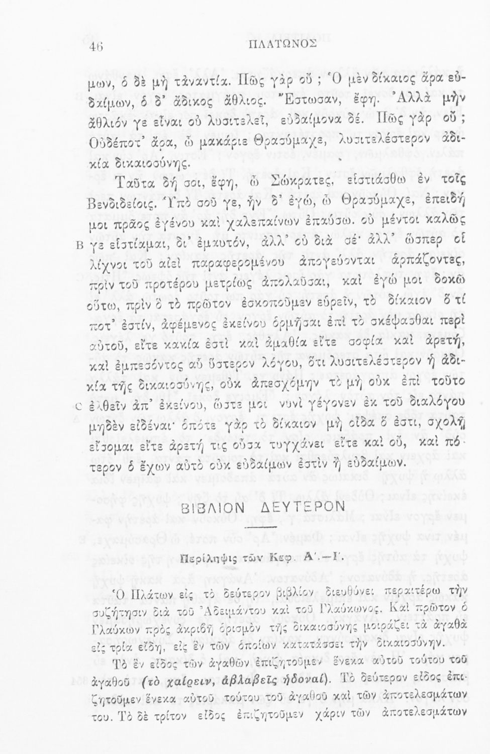 Σχολικό εγχειρίδιο Αρχαίων Ελληνικών για την τελευταία τάξη των Γυμνασίων και Διδασκαλείων. Το βιβλίο περιέχει το έργο του Πλάτωνα, 'Πολιτεία'. Το κείμενο συνοδεύεται από γλωσσικές και ερμηνευτικές σημειώσεις.