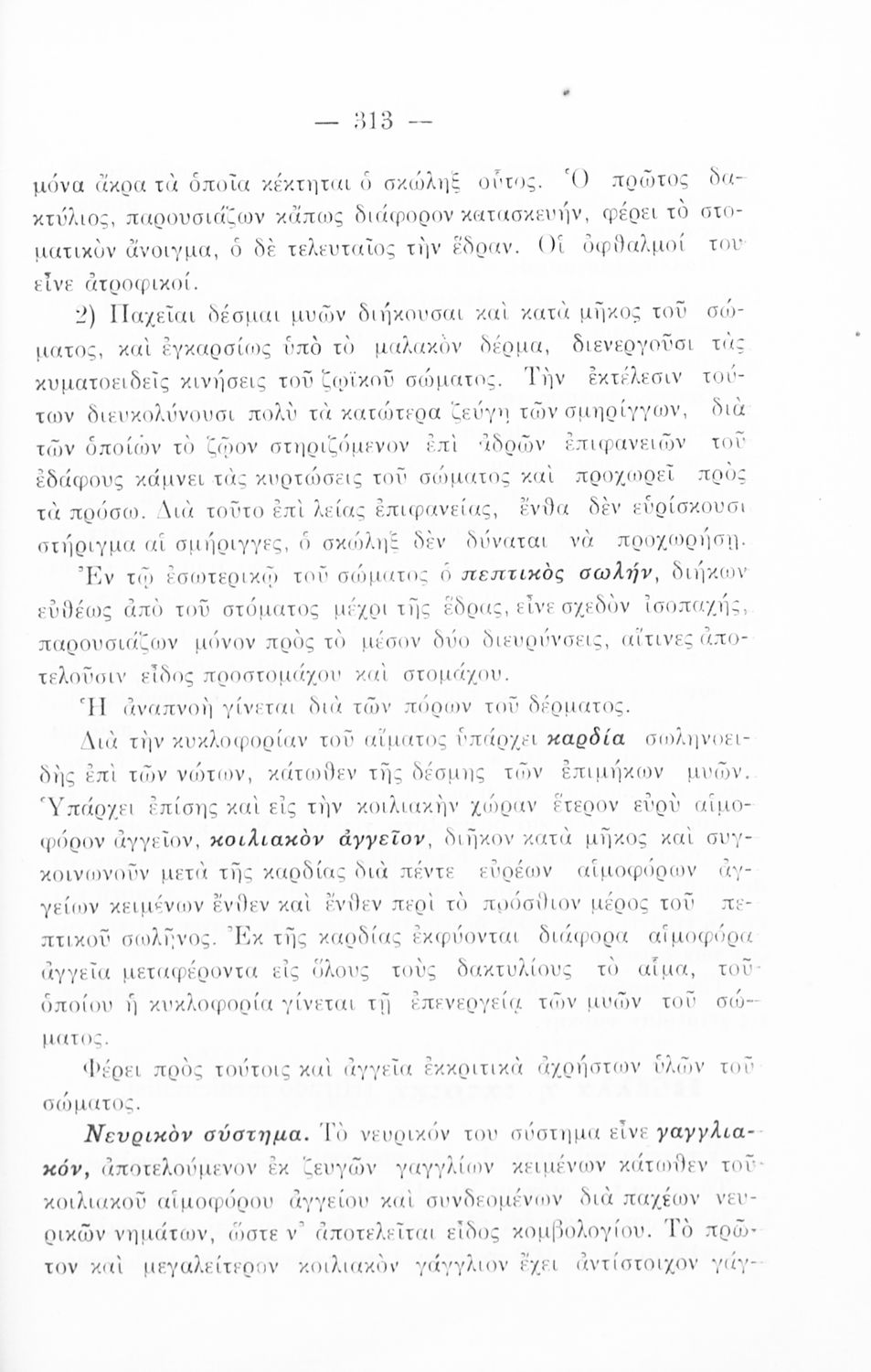 Σχολικό εγχειρίδιο Ζωολογίας για τα Γυμνάσια, τα Παρθεναγωγεία και τα Διδασκαλεία που εστιάζει στην ανθρώπινη φυσιολογία και παρουσιάζει τα διάφορα ζώα ανάλογα με την συνομοταξία στην οποία ανήκουν.