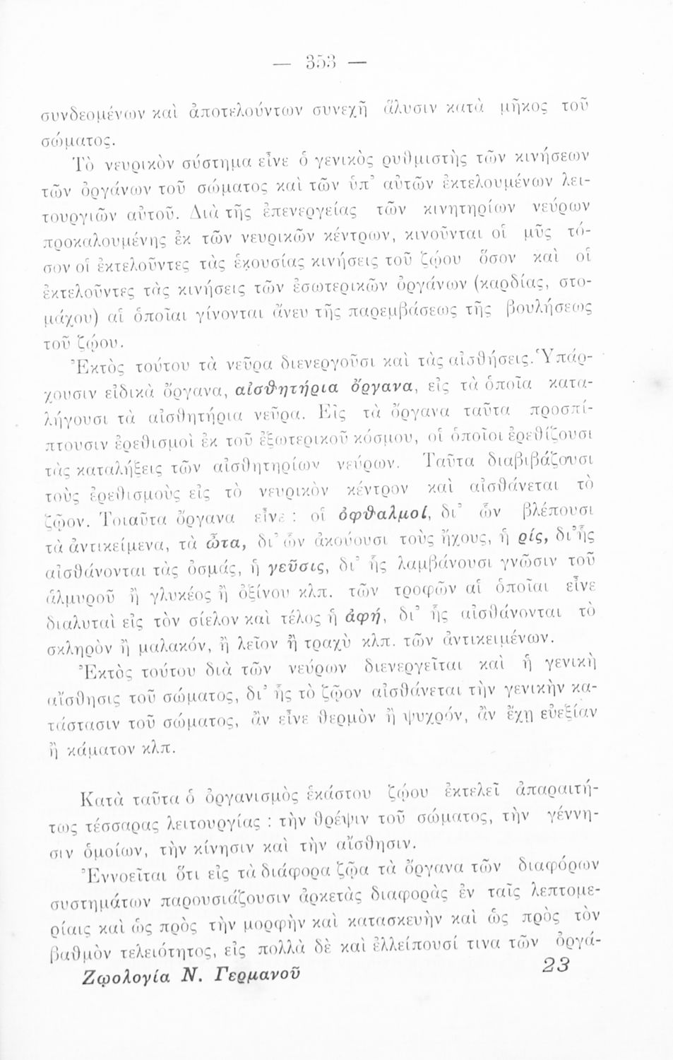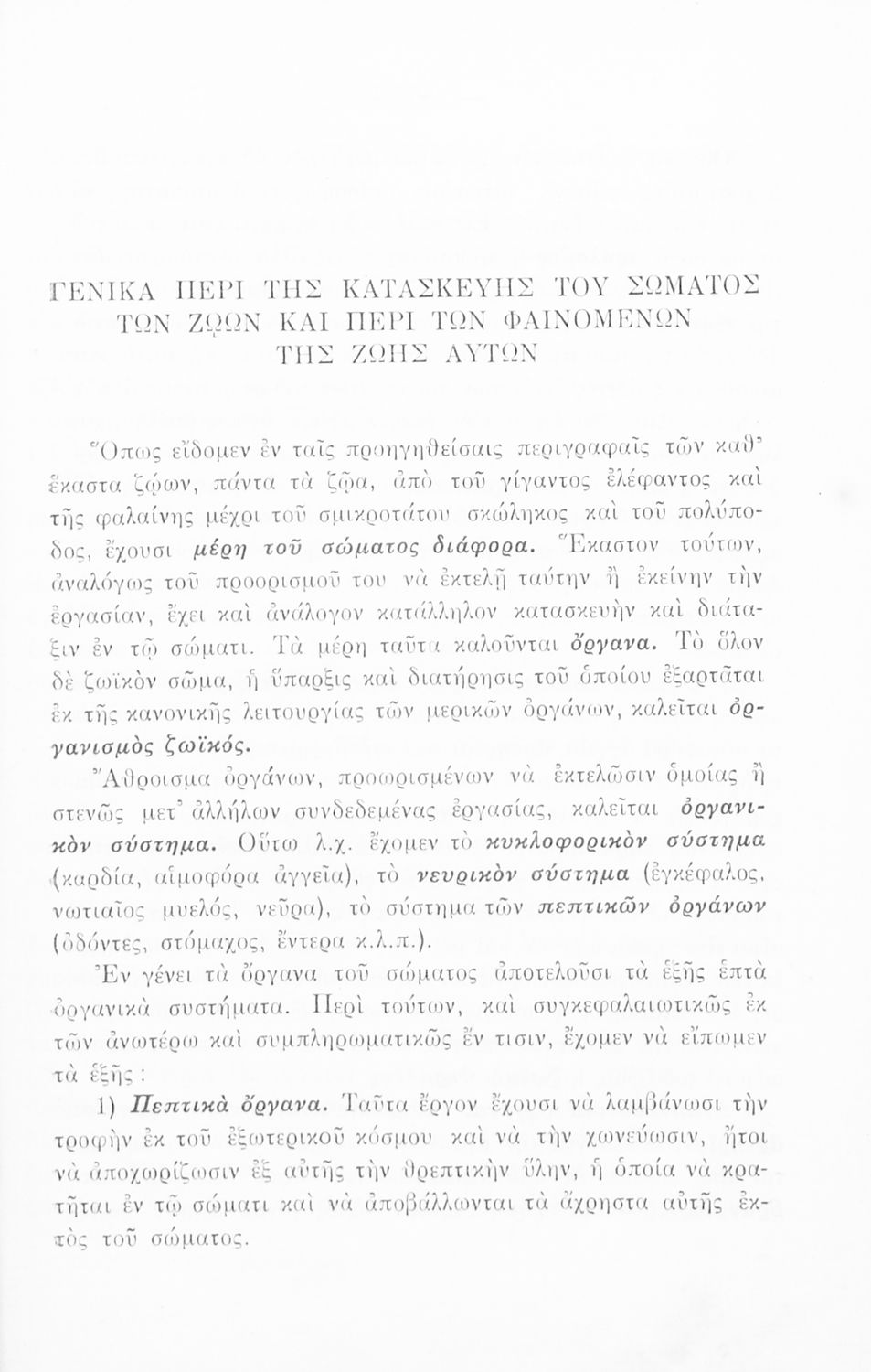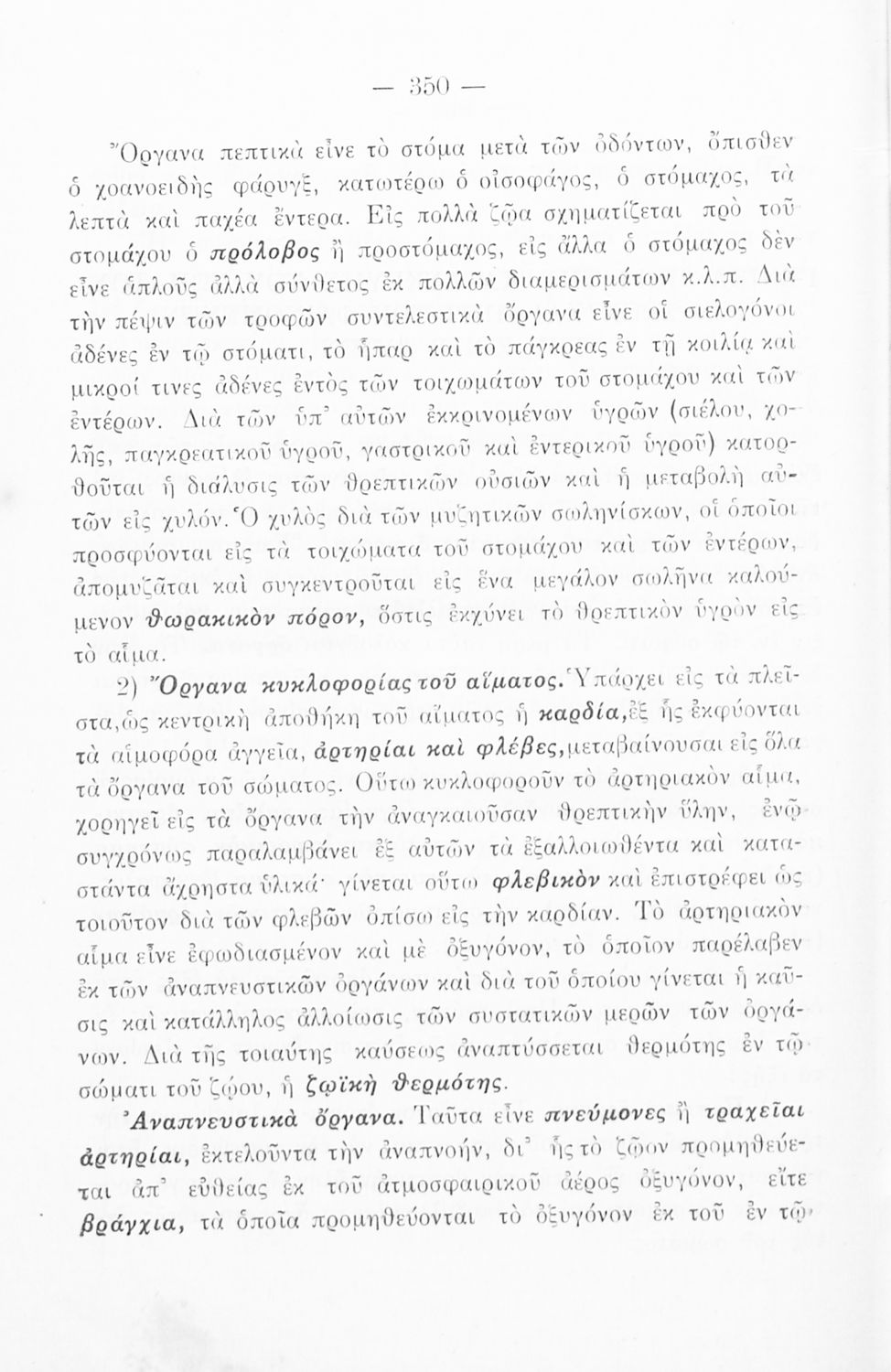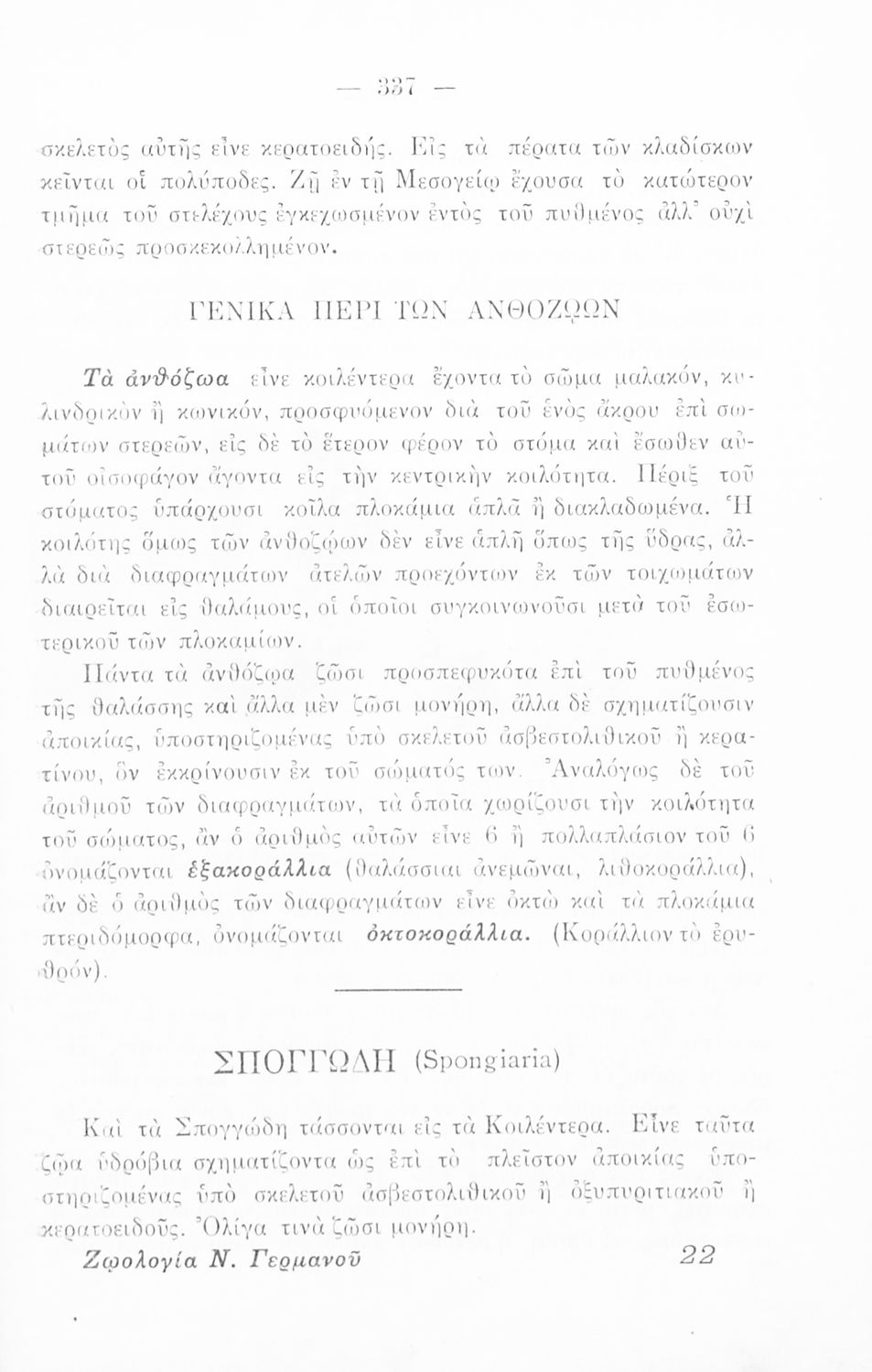 Σχολικό εγχειρίδιο Ζωολογίας για τα Γυμνάσια και τα Διδασκαλεία που εστιάζει στην ανθρώπινη φυσιολογία και παρουσιάζει τα διάφορα ζώα ανάλογα με την συνομοταξία στην οποία ανήκουν.