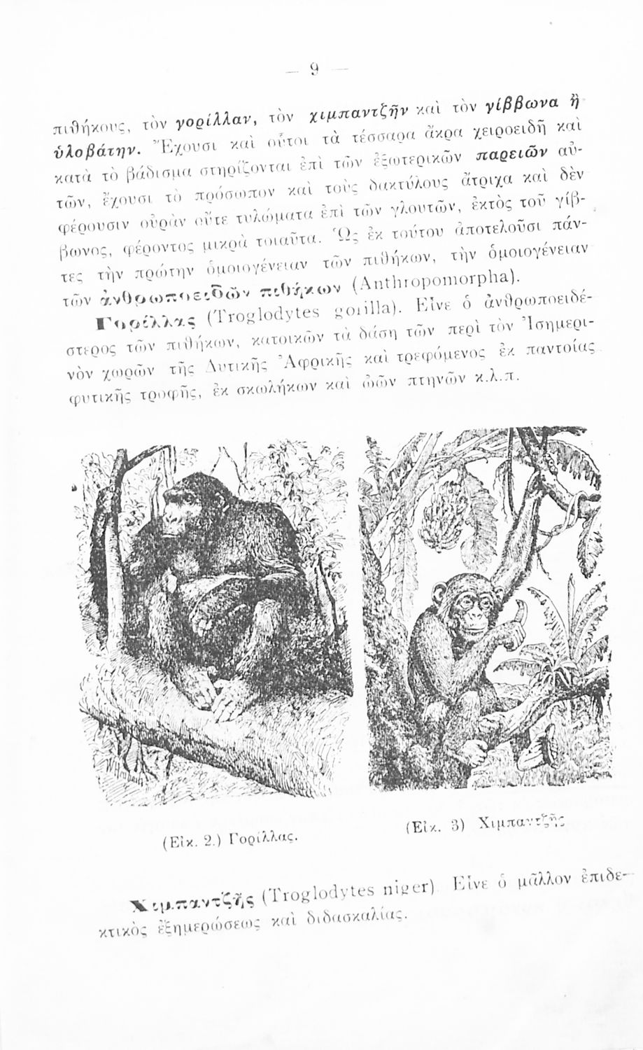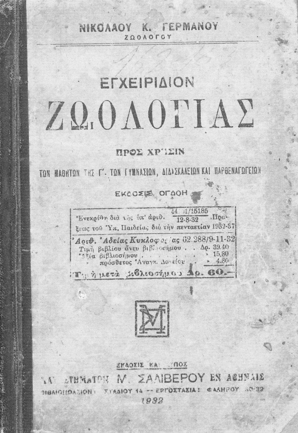 Σχολικό εγχειρίδιο Ζωολογίας για τα Γυμνάσια και τα Διδασκαλεία που εστιάζει στην ανθρώπινη φυσιολογία και παρουσιάζει τα διάφορα ζώα ανάλογα με την συνομοταξία στην οποία ανήκουν.