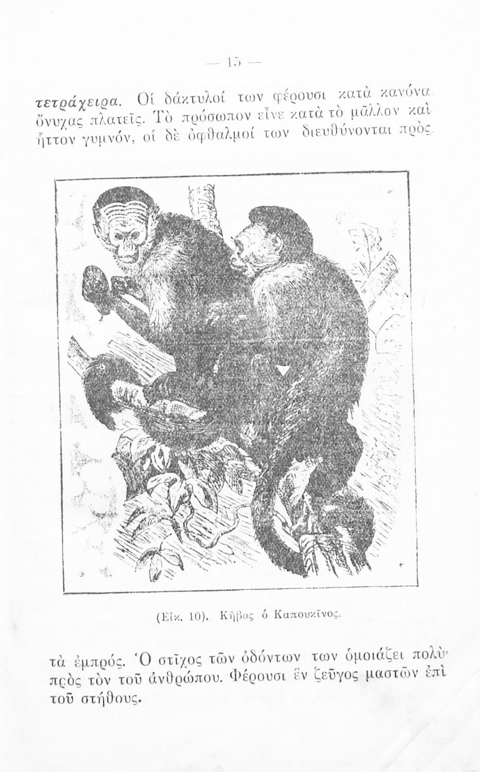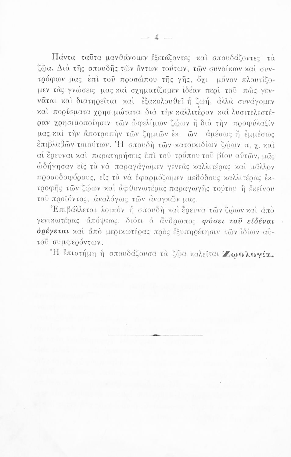 Σχολικό εγχειρίδιο Ζωολογίας για τα Γυμνάσια, τα Παρθεναγωγεία και τα Διδασκαλεία που εστιάζει στην ανθρώπινη φυσιολογία και παρουσιάζει τα διάφορα ζώα ανάλογα με την συνομοταξία στην οποία ανήκουν.